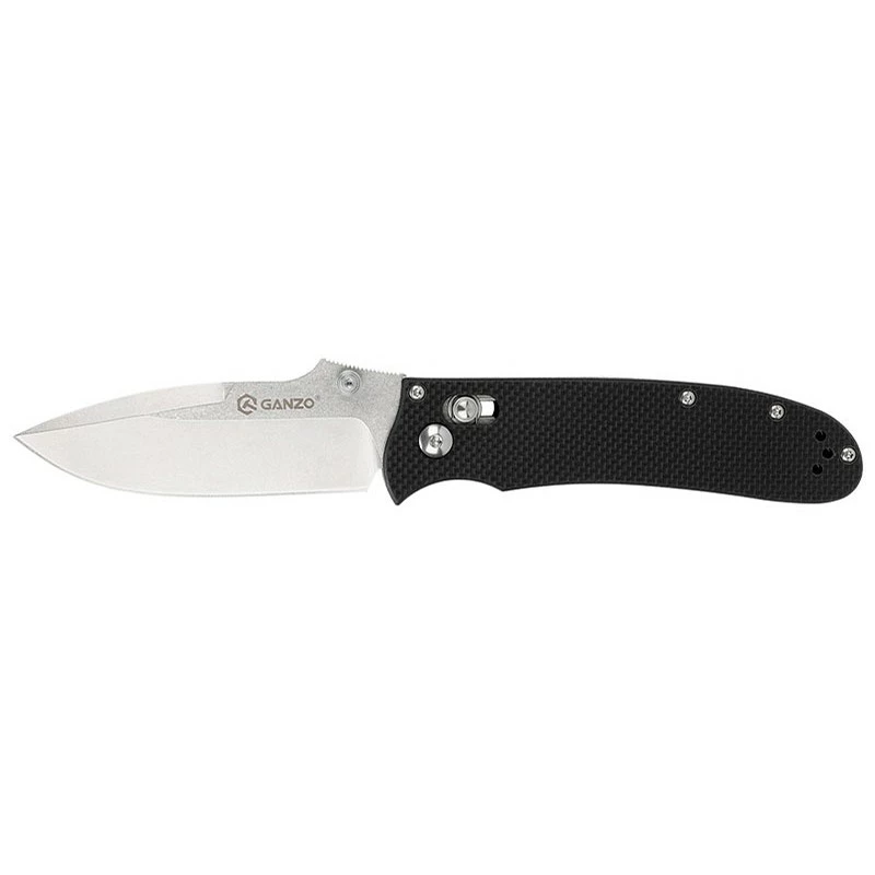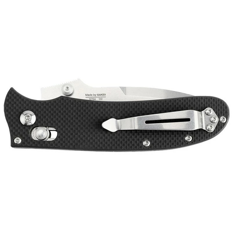Le Ganzo D704, coloris noir, possède également une lame drop point de 85mm si bien que la longueur totale du couteau est de 20cm. La lame est fabriquée en D2, un acier de haute qualité adapté aux conditions d’utilisation extrêmes et qui conserve son affûtage très longtemps. Elle se verrouille via le mécanisme G-Lock et s’avère être décorée par le logo Ganzo sans oublier le thumb stud double pour la facilité de déploiement.