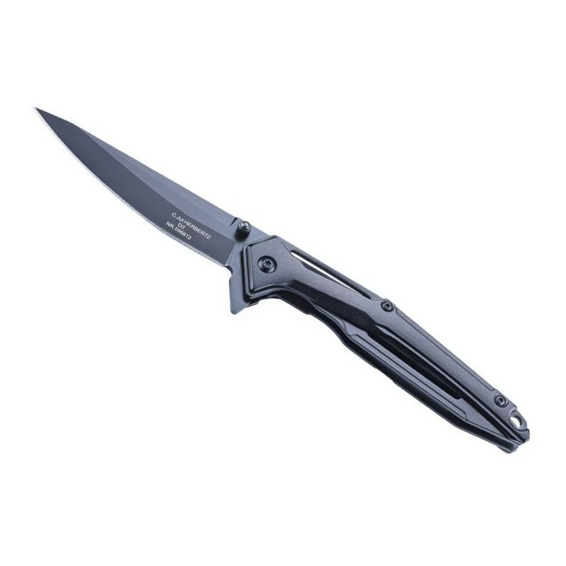 Ce couteau pliant Herbertz 596612 est muni d’un look moderne. Il possède une lame noire d’environ 96mm de longueur, conçue en acier D2, un acier réputé pour ses excellentes performances. Cette même lame peut être ouverte en toute simplicité par le biais du flipper ou encore le double thumb stud, le mécanisme ball bearing fait en sorte que les ouvertures soit très fluides. Pour que les utilisations soient très sûres, vous pourrez compter sur un mécanisme de verrouillage extrêmement fiable. Le manche en aluminium noir est usiné, il comporte de nombreux trous ce qui apporte style tout en assurant une réduction du poids du couteau. La poignée noire fait en sorte que la transportabilité soit exceptionnelle via son clip au dos mais aussi le trou pour lanière ou cordon en bout. Le modèle Herbertz 596612 est pourvu d’un design entièrement noir.