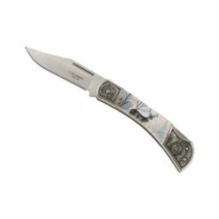 Faites plaisir à moindre coût à un passionné de chasse avec ce couteau Herbertz portant la référence 590411. Il possède une lame pliante à cran fabriquée en acier 420 : un excellent compromis entre tranchant et résistance, notamment à la rouille. Gardez bien à l’esprit que la lame est personnalisable par gravure (voir bouton ci-dessous pour plus d’informations). Toute la particularité de ce modèle réside dans le fait que son manche en acier comporte des mitres gravées sur les extrémités, mais surtout un magnifique décor cerf sur la partie centrale. Un joli cerf avec bois qui domine fièrement le paysage, on peut observer en arrière-plan des arbres ou encore une partie du ciel. Avec un design très nature, le manche de ce couteau pliant Herbertz 590411 est aussi ergonomique et transportable avec une longueur de 11cm. Vous n’aurez aucune difficulté pour le transporter au quotidien, à la chasse par exemple !