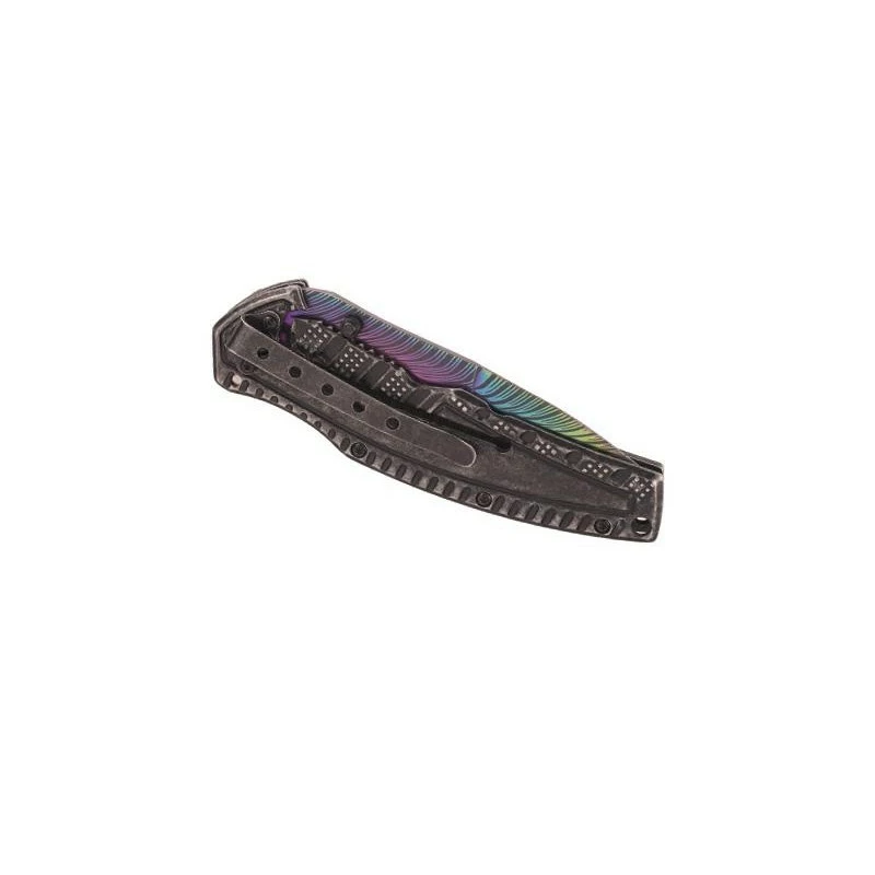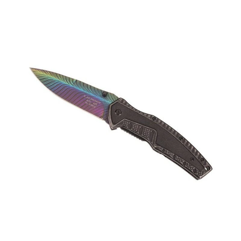 Doté de la référence 579512, ce couteau de poche Herbertz se dote d’une lame en acier 420 avec motif plume arc-en-ciel : elle est très tranchante et juste sublime à admirer. La lame est à cran intérieur et à bouton double. Côté manche, il est en acier avec insert G10 noir et mesure exactement 12cm de longueur. Le manche est très agréable à tenir en main : un clip est présent afin de faciliter le transport de ce couteau Herbertz.