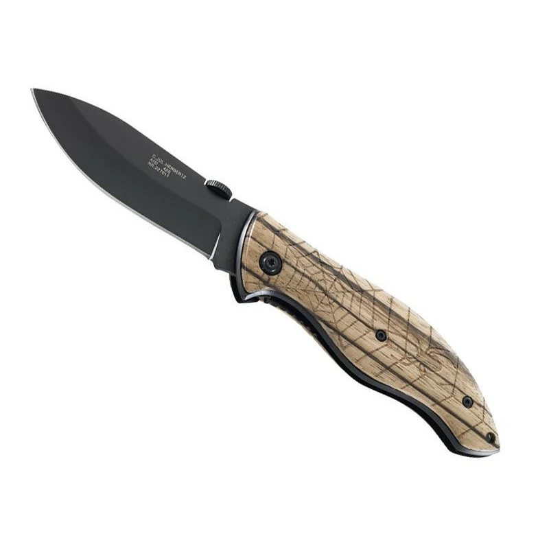 Le bois zebrano est facilement reconnaissable par ses stris apparents, c’est d’ailleurs le matériau utilisé lors de la conception du manche de ce couteau Herbertz 227011. Très original, le manche mesure 11cm de long et est décoré par une grosse toile d’araignée située sur toute la longueur du manche en bois zebrano. En regardant le manche avec plus d’attention, on peut également apercevoir l’araignée sur la toile : il faut bien du courage pour utiliser ce couteau pliant Herbertz !