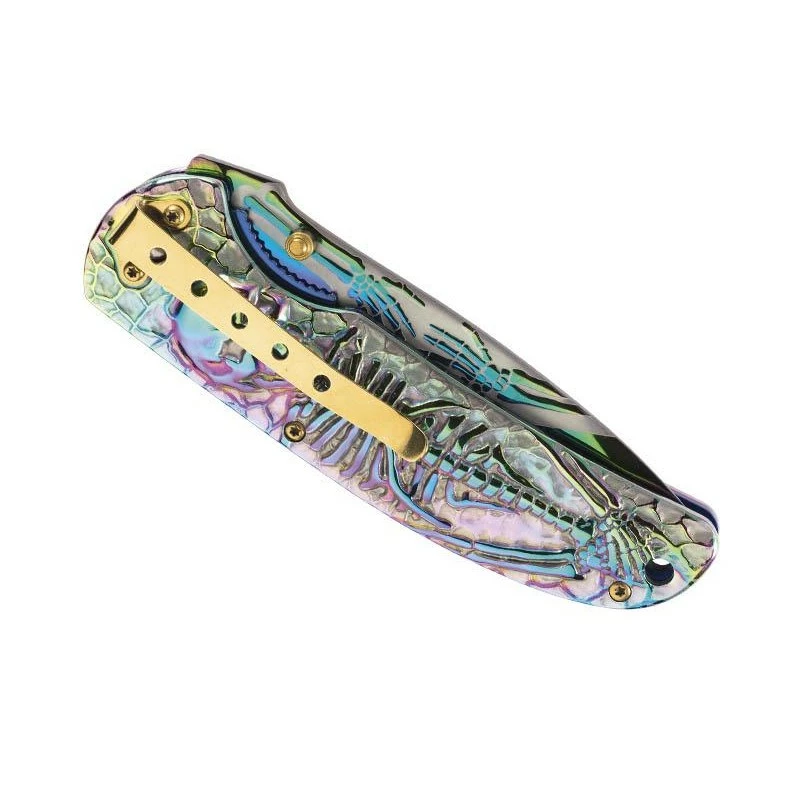 La lame est elle aussi très originale. Fabriquée en acier inoxydable 420, elle est à cran et à bouton double. Elle est aussi décorée façon arc-en-ciel et on peut voir deux mains de squelette dessus. Ce couteau de poche Herbertz pourra séduire aussi bien un homme qu’une femme, à condition qu’il ou qu’elle aime l’originalité !
