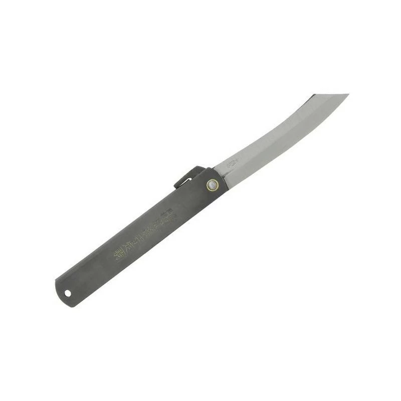 La culture Japonaise Ă l’honneur avec ce couteau Higonokami portant la rĂ©fĂ©rence 670. Comme d’habitude, on trouve une lame en acier carbone San Mai (3 couches) très caractĂ©ristique de la marque Japonaise. La composition est la suivante : un noyau dur en acier carbone ainsi qu’une couche externe protectrice en acier doux. Grâce Ă cela, la lame du couteau pliant Higonokami 670 est Ă la fois tranchante et rĂ©sistante. Pour l’ouvrir, c’est très simple, il suffit d’appuyer sur l’excroissance dans le prolongement de la lame (morceau d’acier qui dĂ©passe) : il s’agit du système PiĂ©montais. Le manche lui, est fabriquĂ© en acier noir et mesure 12cm de longueur : il offre une excellente transportabilitĂ©, notamment grâce au trou percĂ© en bout (accrochage via ficelle ou cordon). Il est dĂ©corĂ© par la signature du forgeron ce qui ajoute une touche design en plus d’une note historique.