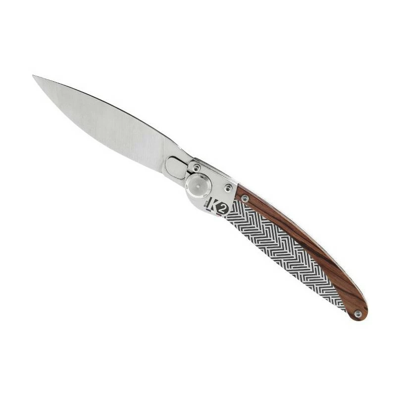 Ce couteau K2 motif labyrinthe ne manque pas de tranchant en raison de sa lame de 78mm de longueur en acier Z40C13. Une lame qui bénéficie du tout nouveau système de verrouillage K-Lock, un mécanisme à la pointe de l’innovation. On notera le fait que la lame a une forme qui ressemble étrangement à celle d’un poisson. Possibilité de personnalisation par gravure, pour faire ou se faire plaisir. D’ailleurs, sachez que votre couteau de poche K2 labyrinthe vous sera livré dans son étui suédine marron, avec une pochette cadeau K2 100% Français. Un couteau au rapport qualité/prix difficilement égalable !