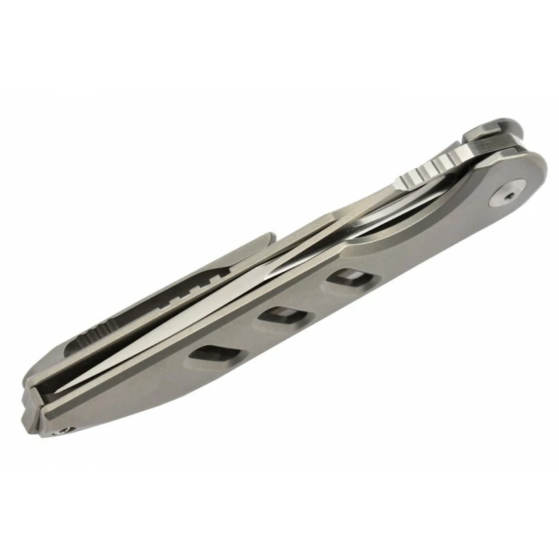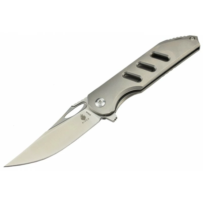 Le Kizer Assassin, signé Carlos Elstner, est un couteau pliant à verrouillage frame lock, possédant un manche en titane de 105mm de longueur simple à transporter, notamment grâce à sa fente permettant d’accrocher une lanière. La poignée est embellie de motifs fraisage en forme de trait, ce qui apporte du style, de l’élégance. Longueur du manche : à peine 105mm, à noter que le confort de prise en main est de mise.