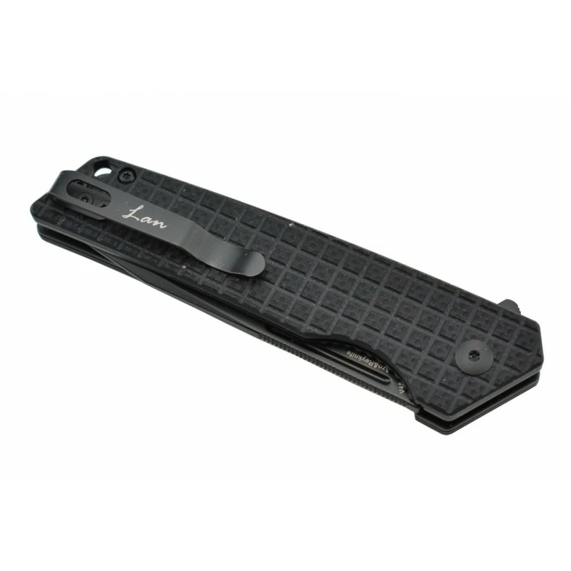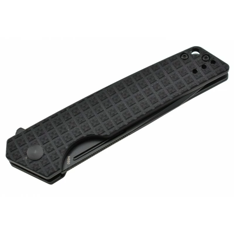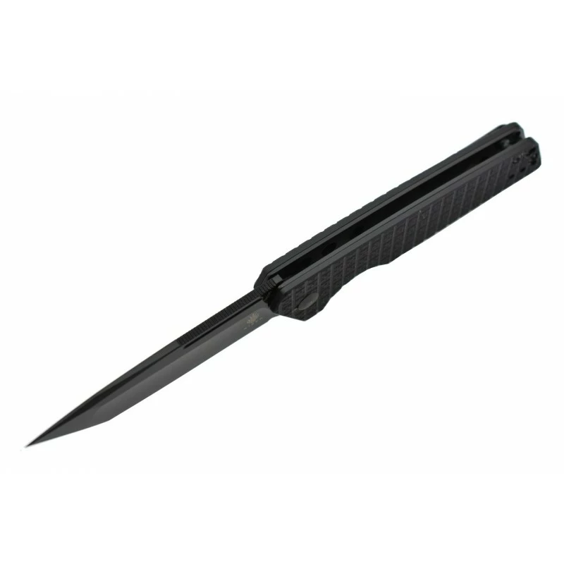 L’acier N690 est de l’acier autrichien, connu pour sa rétention de tranchant et sa résistance à la corrosion, ce qui en fait un excellent acier pour un couteau pliant. D’une longueur de 85mm, la lame tanto comporte ici une finition black et a une ouverture par flipper.