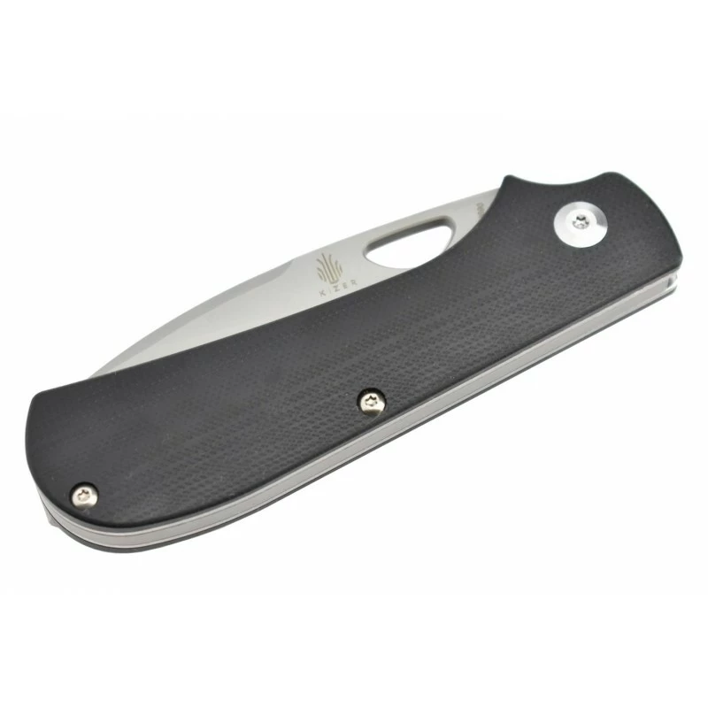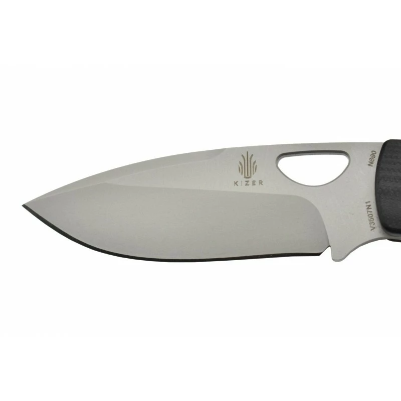 Conçu par Michael Vagnino et Tom Ferry, le Kizer Vanguard Zipslip, modèle V3507N1, est un couteau pliant très polyvalent, convenant notamment pour les tâches quotidiennes. Il possède une lame drop point, ajourĂ©e et dĂ©corĂ©e par le logo Kizer, mesurant 72mm de longueur et fabriquĂ©e en acier Bohler N690. Personnalisable, la lame bĂ©nĂ©ficie d’une finition stonewashed dĂ©lavĂ©e pour le masquage des rayures. Épaisseur de la lame : 3mm.