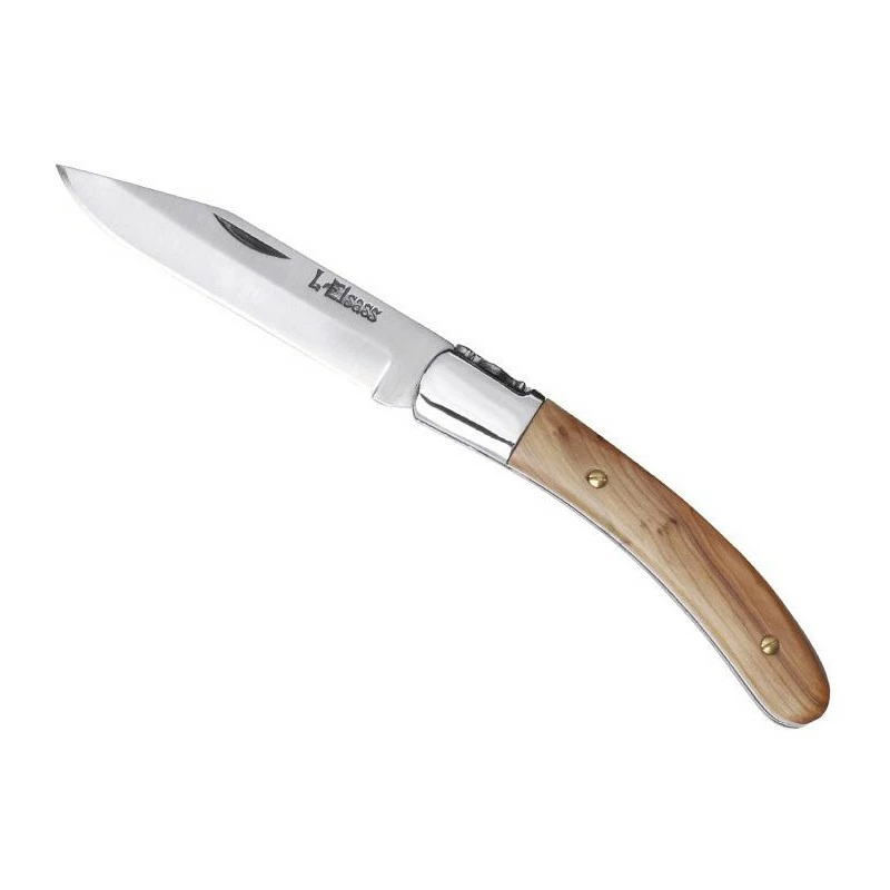 En Alsacien, Elsass signifie Alsace, on comprend donc rapidement que ce couteau pliant fait référence à cette belle région de l’Est de la France. Il est muni d’un manche en bois genévrier, avec mitre en acier inox mat et ressort guilloché avec cigogne, un oiseau emblématique qui est le symbole de l’Alsace. La forme de la poignée genévrier est légèrement courbée ce qui confère de l’élégance tout en apportant du confort au quotidien, au moment des manipulations. La lame est fabriquée en acier inoxydable Z100, résistante à la corrosion/rouille, elle est aussi marquée par l’inscription Elsass ainsi que personnalisable par gravure au niveau des deux faces. Si vous appréciez la région Alsace ainsi que les couteaux, alors nul doute que ce modèle 1456 vous séduira.
