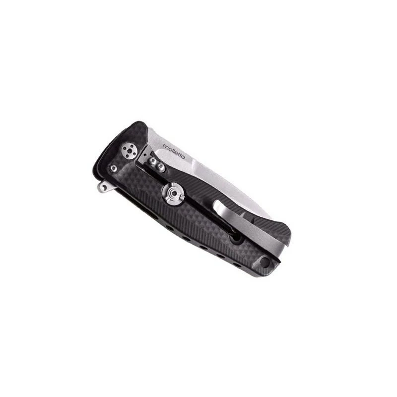 Ce modèle SR22 est en quelque sorte le « petit frère » du couteau LionSteel SR11 aluminium noir. Il est fabriqué à partir des mêmes matériaux, au même endroit, mais dispose d’un gabarit moins imposant (plus petit). C’est donc tout naturellement qu’il possède un manche noir en aluminium avec clip réversible et pic brise-vitre. Un manche qui est une nouvelle fois doté de la technologie SOLID (manche fabriqué en centre d’usinage à partir d’une seule pièce de matière). Toutefois, comme il a déjà été dit, sur ce couteau LionSteel SR22A.BS, le manche est plus petit avec une longueur de seulement 10cm. C’est donc logiquement que ce couteau se révèle plus facile à transporter. Côté lame, elle est toujours fabriquée en acier Sleipner satiné avec flipper et cran intérieur mais ne mesure que 8cm de long. Avec système IKBS pour une ouverture de lame toujours rapide et facile. Design par Molletta alias Pensato Michele.