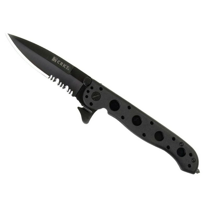 C’est Kit Carson qui est à l’initiative du CRKT M16-13ZLEK, modèle Law Enforcement signifiant forces de l’ordre. On comprend donc immédiatement que nous sommes en présence d’un couteau pliant tactique pour professionnels exigeants. Le M16-13ZLEK possède une lame semi-dentée, fabriquée en acier AUS-8 riche en carbone, comprenant un revêtement en nitrure de titane noir. À bouton double, la lame intègre un Carson Flipper pour faciliter son déploiement, ce dernier fait aussi office de coupe-ceinture. Durant les utilisations, la sécurité est de mise, grâce au liner lock, mais surtout le système Automated Liner Safety (levier de sécurité supplémentaire pour la fermeture de la lame). Le couteau CRKT M16-13ZLEK Law Enforcement noir est doté d’un manche en nylon et fibre de verre, particulièrement résistant, avec fonction brise-vitre en bout en cas d’urgence. Comme tous les couteaux issus de la série M16, le manche est ici à trous, avec un beau coloris noir ainsi qu’un clip de poche au verso. Un couteau pliant conçu par des professionnels, pour des professionnels !