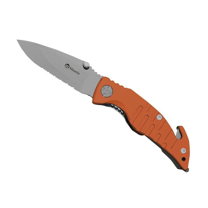 Le couteau pliant Maserin Rescue 2 est dotĂ© d’une lame Ă dents conçue en acier satinĂ© N690Co Ă cran intĂ©rieur et Ă bouton : elle mesure 90mm de longueur. Parfait pour les activitĂ©s de sauvetage et de secourisme, le couteau possède aussi un manche de longueur 12cm en aluminium anodisĂ© orange, il fait Ă©galement office de pic brise-vitre et coupe-ceinture de sĂ©curitĂ©. Grâce au clip, le couteau Maserin Rescue 2 rĂ©fĂ©rence 283 est facile Ă transporter : il vous suivra durant toutes vos interventions sans jamais vous gĂŞner. Pratique, ce modèle conçu en Italie est livrĂ© avec son Ă©tui en nylon permettant d’en prendre soin au quotidien. Un couteau de poche signĂ© Maserin pour tous les sauveteurs !