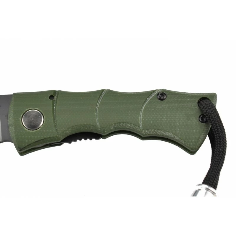 Le Max Knives MKBAM OG se diffĂ©rencie des autres modèles par la couleur de son manche, vert. Toujours dĂ©corĂ© façon bambou en raison de ses trois petits traits verticaux, le manche est fabriquĂ© en G10, et mesure 77mm de long pour une facilitĂ© de port Ă toute Ă©preuve. Avec lacet en bout pour accrocher le couteau facilement, il y a Ă©galement une paracorde ainsi qu’un Ă©tui de type kydex. Le système de verrouillage de lame est ici de type liner-lock, un grand classique dans le milieu de la coutellerie de poche.