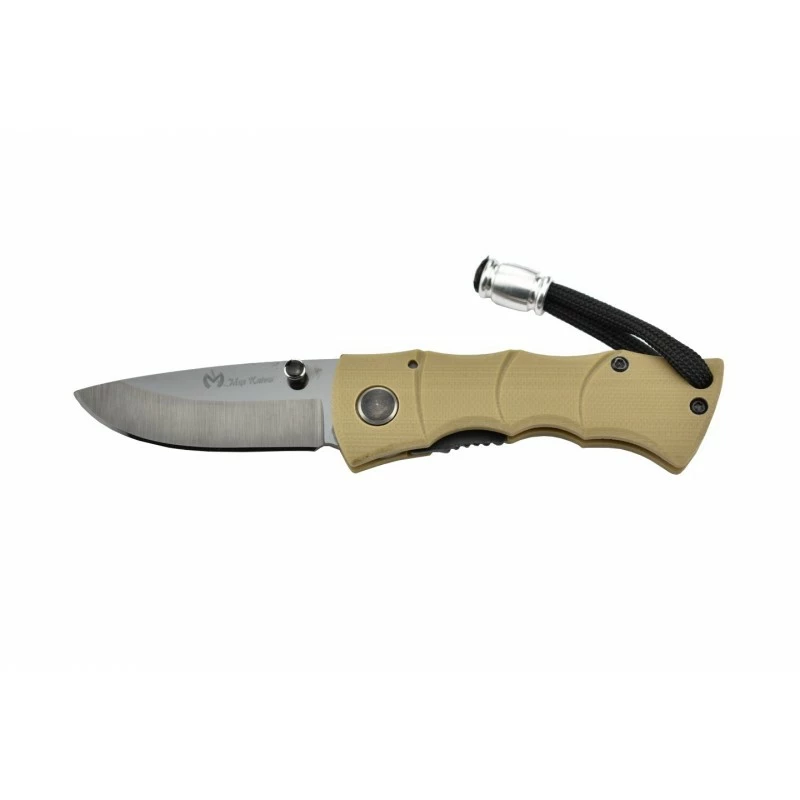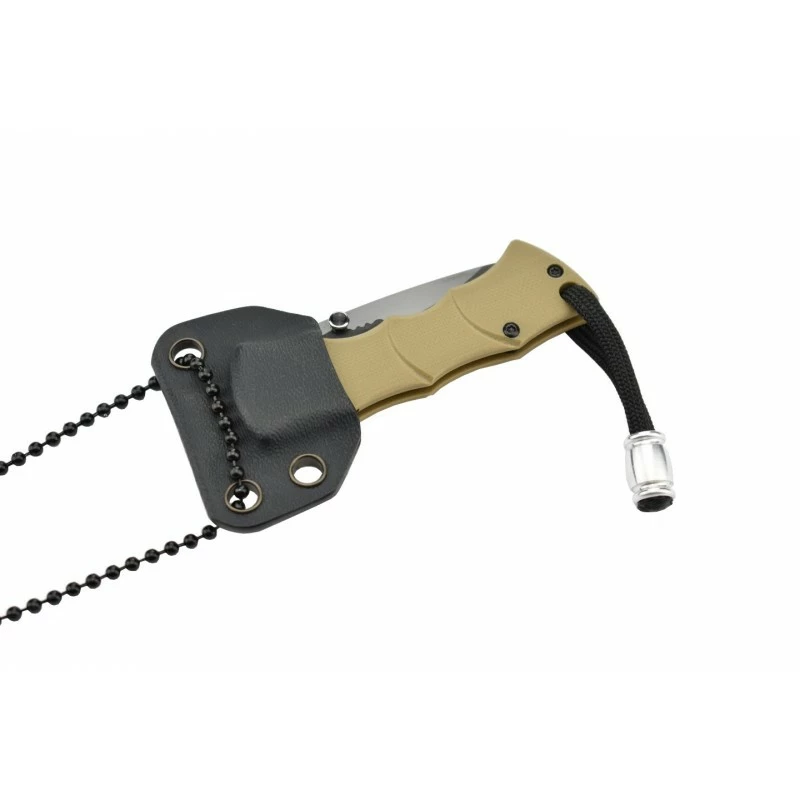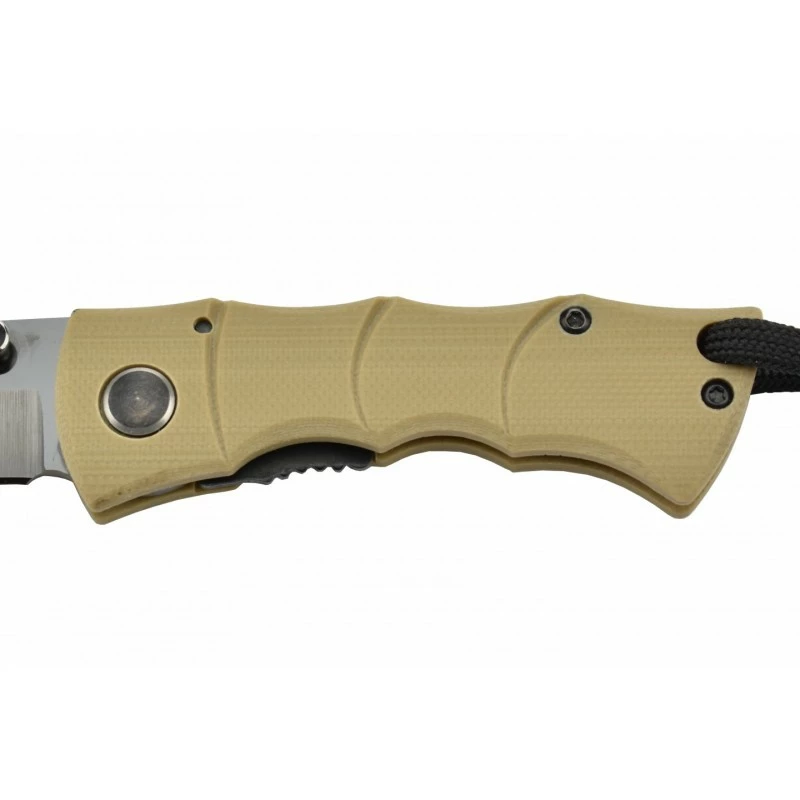 Petit couteau pliant Max Knives, modèle MKBAM OT, possédant un manche finition désert sable conçu en G10, avec effet bambou très design, stylé. Prise en main confortable et facilité de port grâce à la longueur de 77mm en position fermée, avec lanyard et paracorde. À noter qu’ici, il s’agit d’un couteau pliant à verrouillage liner lock.