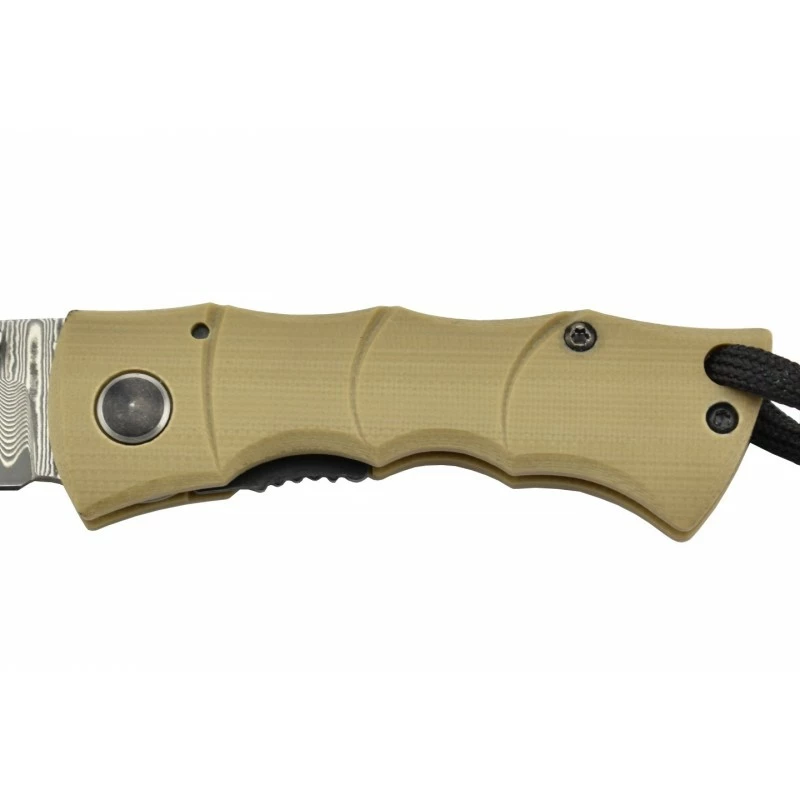 Le couteau de poche Max Knives MKBAM OTD dispose aussi d’un manche en G10 coloris sable, avec un effet façon bambou pour l’élégance, le style. On mentionnera le fait que la poignée mesure 77mm de long, ce qui assure une aisance de port quotidienne ainsi qu’une prise en main agréable et sûre. Voici les accessoires que comprend le Max Knives MKBAM OTD : paracorde, étui kydex ainsi que lanyard. Longueur totale en position ouverte : environ 13cm.