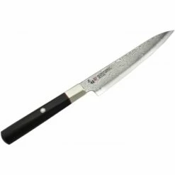 C’est le fabricant Japonais Mcusta qui est à l’origine de ce couteau de cuisine Petty, série HZ2 Splash Hybrid. Ce modèle HZ2-3002DS est un must pour préparer les fruits et légumes avec la plus grande précision, pour un résultat final qui ne manquera pas de bluffer dans l’assiette ! Le couteau possède ici une lame de 15cm de longueur, elle est fabriquée en acier Damas San Mai 33 couches avec un cœur en VG-10 pour le tranchant. La lame bénéficie d’un tranchant symétrique poli miroir qui contraste à merveille avec le reste de la lame qui lui est mat. La poignée est conçue en pakkawood noir stabilisé conférant une excellente ergonomie tout en venant confirmer le côté luxueux, prestigieux. Entre le manche et la lame damas, on peut observer une mitre en alliage nickel-argent de haute qualité. Une fois de plus la marque Japonaise Mcusta montre ce dont elle est capable avec ce couteau de cuisine Petty HZ2-3002DS Splash Hybrid.