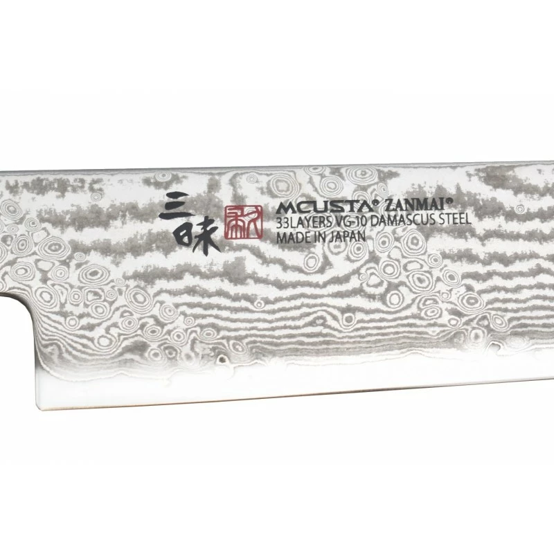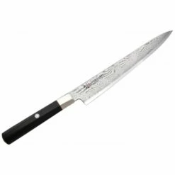 Dans le domaine de la cuisine, la marque Japonaise Mcusta est très populaire, c’est très clairement un gage de qualité. Ce modèle HZ2-3010DS Splash Hybrid Sujihiki possède une lame de 24cm de longueur qui se révèle être redoutable d’efficacité pour la préparation minutieuse des viandes et poissons. La lame possède un cœur en VG-10 entouré de couches d’acier damas afin d’être en parfaite adéquation avec la tradition Japonaise. La lame est de forme ogive et le tranchant poli miroir ce qui met particulièrement bien en avant les motifs Sanmai. Ce couteau de cuisine Japonais, Mcusta HZ2-3010DS Splash Hybrid Sujihiki 240, possède un manche noir en pakkawood stabilisé comprenant une mitre en alliage nickel-argent de haute qualité. Une élégante poignée dont le style vient parfaitement parfaire l’ensemble : une pièce des plus élégantes, ergonomiques mais aussi performantes ! Ce couteau Mcusta Sujihiki existe aussi en version lame 27cm.