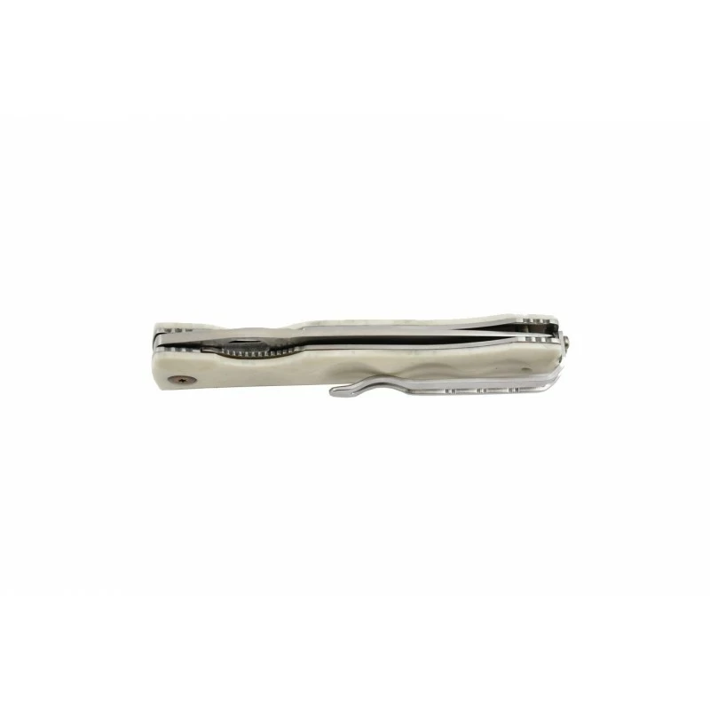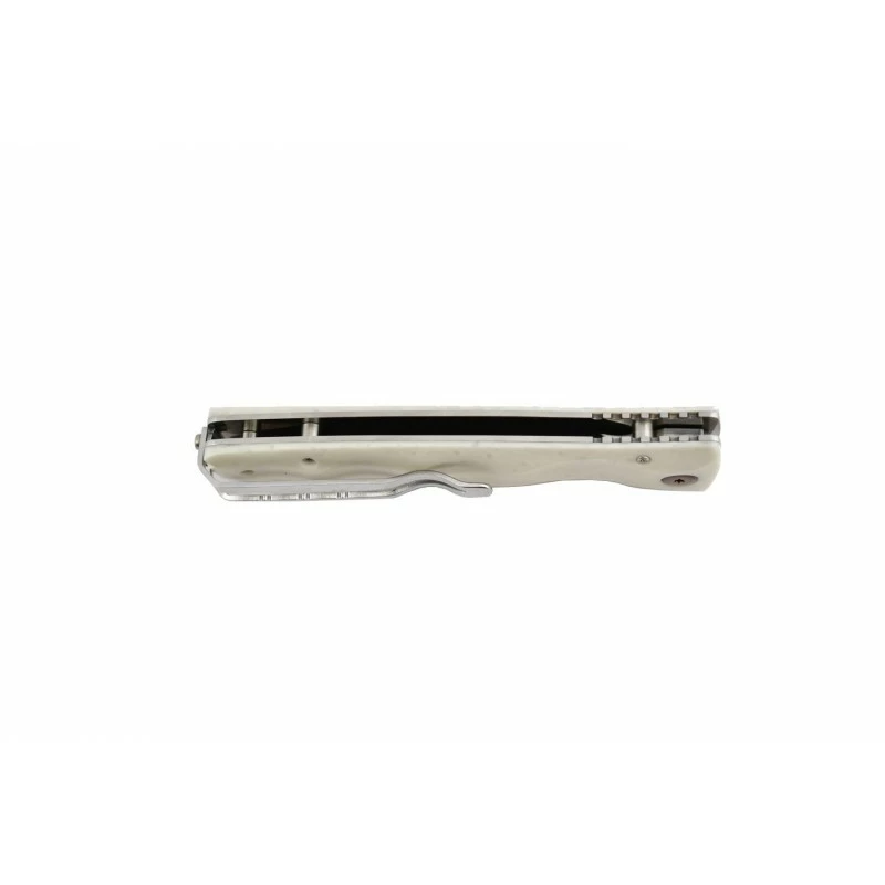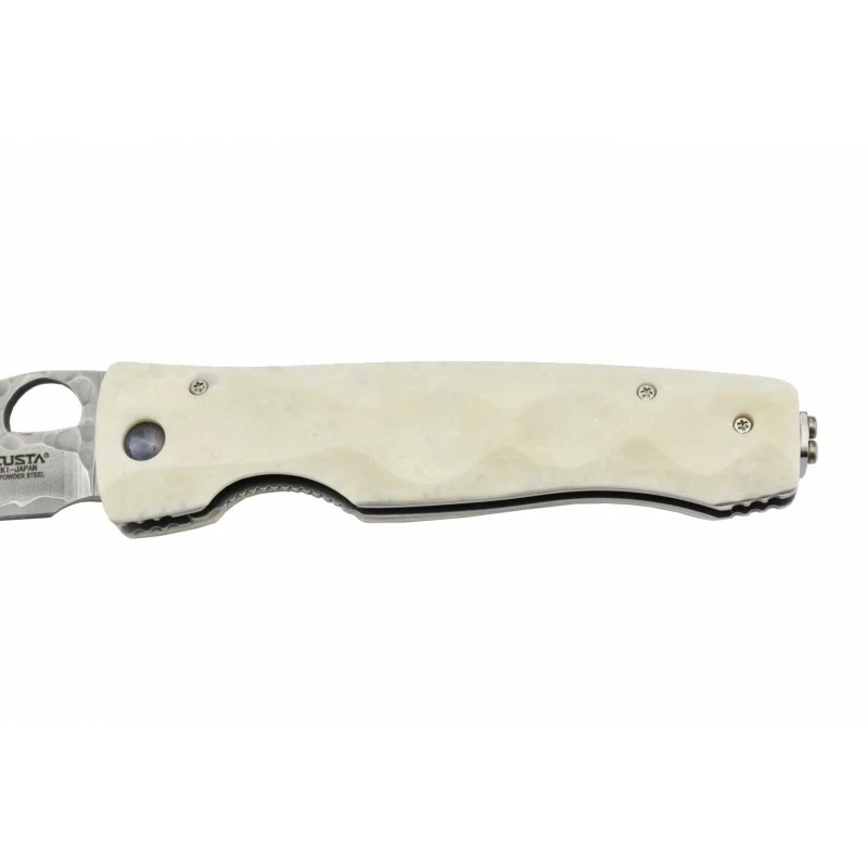 Ce couteau pliant Mcusta MC-126G est doté d’une allure classe, très soignée en raison de son manche de 115mm en corian (coloris blanc). Toujours très ergonomique, le manche est aussi très transportable si bien que l’utilisateur n’aura aucune difficulté pour transporter le couteau Japonais au quotidien. Côté lame, elle est fabriquée à partir de l’acier innovant SPG2 et martelée au niveau de la partie supérieure. On notera la présence d’un trou rond rendant l’ouverture de lame plus facile, ainsi que le logo Mcusta juste en-dessous pour la note décorative. À noter que la lame se verrouille/déverrouille grâce au système de verrouillage Liner Lock, sans doute le plus connu et utilisé dans le vaste domaine de la coutellerie. Le Mcusta MC-126G est un couteau de poche Japonais soucieux du détail : les finitions sont faites à la main. Un modèle qui pourra également plaire aux collectionneurs !