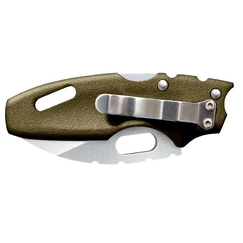 Le Mini Tuff Lite Cold Steel est un couteau de poche suffisamment compact pour pouvoir être transporté facilement, et suffisamment résistant pour faire le travail. Pratique, il se glisse aisément dans la poche (longueur en position fermée de 76mm) et peut se clipser facilement à la ceinture grâce au clip de poche au dos. Le Mini Tuff Lite Cold Steel est ici doté d’un manche coloris vert kaki en Griv-Ex, un matériau apprécié pour son ergonomie mais surtout sa résistance à toute épreuve grâce à l’ajout de fibre de verre. On soulignera la présence d’un ajour au bout de la poignée permettant d’y passer une lanière par exemple. La lame elle, est fabriquée en acier inoxydable 4034SS, de profil sheep foot, elle est impitoyablement tranchante et permet même de cisailler les matériaux les plus durs. Comme pour le manche, la lame est ajourée, avec juste en-dessous l’inscription Mini Tuff Lite. Possibilité d’ajouter un petit texte à graver (option facultative).