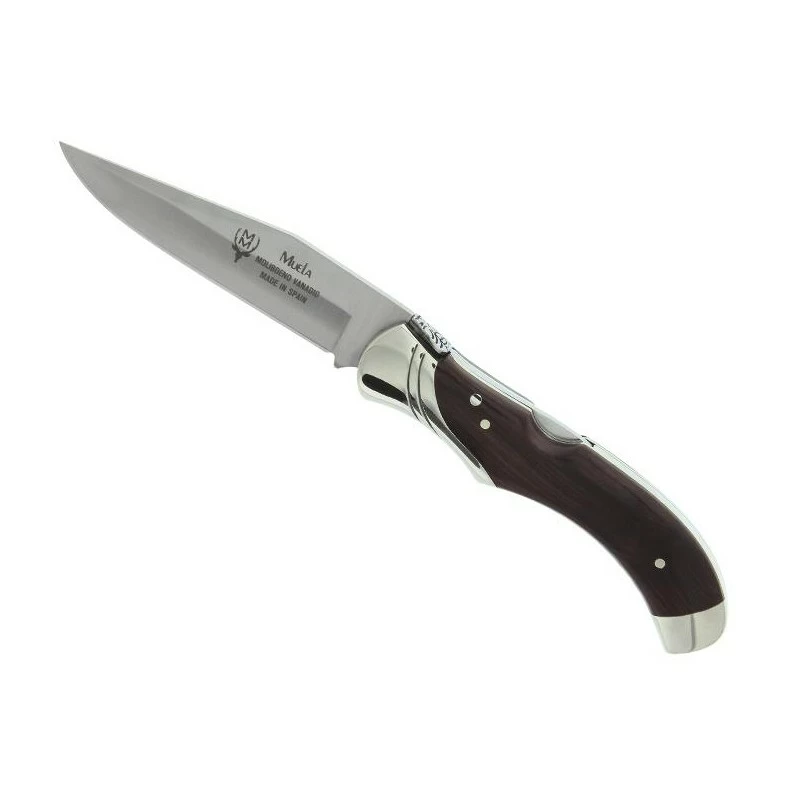 Le Muela GL référence 9355 est un couteau de poche pliant conçu en bois grenadille, avec ressort abeille ainsi que deux mitres maillechort brillant. On peut le dire, le manche est très esthétique, ergonomique (bonne prise en main) mais aussi très transportable grâce à sa longueur de seulement 12cm. De ce fait, le couteau Muela GL grenadille pourra se loger sans aucun problème dans une petite poche de vêtement. De quoi bénéficier en permanence de sa lame à cran en acier inoxydable X50CrMoV15 durant les aventures et déplacements ! À noter que la lame est marquée par le logo Muela, on peut aussi lire le texte « Made in Spain » indiquant une fabrication Espagnole. La lame est personnalisable par gravure, voir le bouton ci-dessous pour de plus amples informations à ce sujet. Le couteau pliant Muela GL est aussi disponible en version manche micarta.