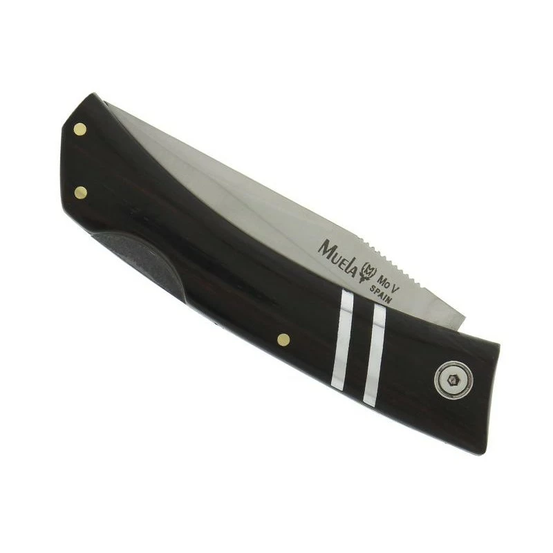 Ce couteau Muela ZX rĂ©fĂ©rence 9353 est hyper Ă©lĂ©gant : il faut dire qu’il possède un plein manche de longueur 11cm fabriquĂ© en bois grenadille avec inserts en alu pour un contraste parfait. L’insert est reprĂ©sentĂ© par deux lignes parallèles espacĂ©es, un effet des plus modernes qui plaira au plus grand nombre. Facile Ă transporter, ce modèle est vendu avec son Ă©tui de protection en nylon. CĂ´tĂ© lame, elle est fabriquĂ©e comme très souvent en acier inoxydable X50CrMoV15. Un acier très utilisĂ© dans le monde de la coutellerie en raison de son excellent tranchant, mais aussi son excellente rĂ©sistance face Ă la corrosion ou rouille. DĂ©corĂ©e par le logo Muela, la lame peut aussi ĂŞtre personnalisĂ©e par les textes de votre choix, sur la face recto et/ou verso (voir bouton ajouter une gravure ci-dessous). Un couteau plein manche ne possède pas de mitre, fabrication Espagnole.