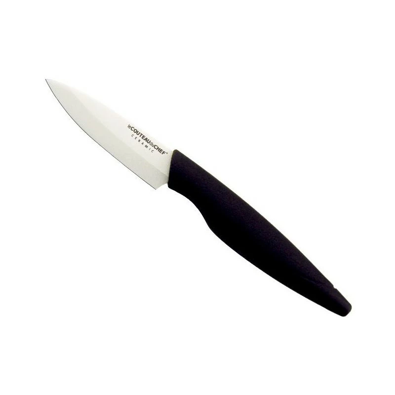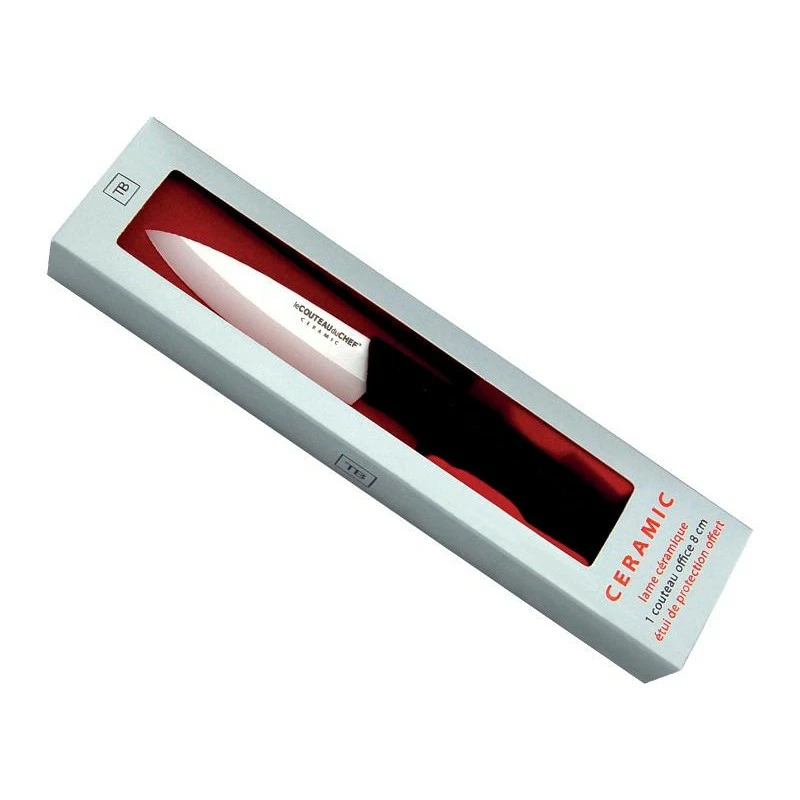 Ce couteau d’office TB dispose d’une lame de 8cm de longueur en céramique blanche, où l’on peut d’ailleurs apercevoir l’inscription suivante : « le couteau du chef Ceramic« . Une lame très dure, qui ne rouille pas, et qui ne nécessite pas d’affûtage, qui permettra de trancher de façon nette les fruits et légumes. L’avantage de la céramique, c’est qu’il s’agit d’un matériau qui ne transmet pas d’odeur aux aliments, il sera ainsi possible de passer d’un légume à un autre juste après un simple rinçage.