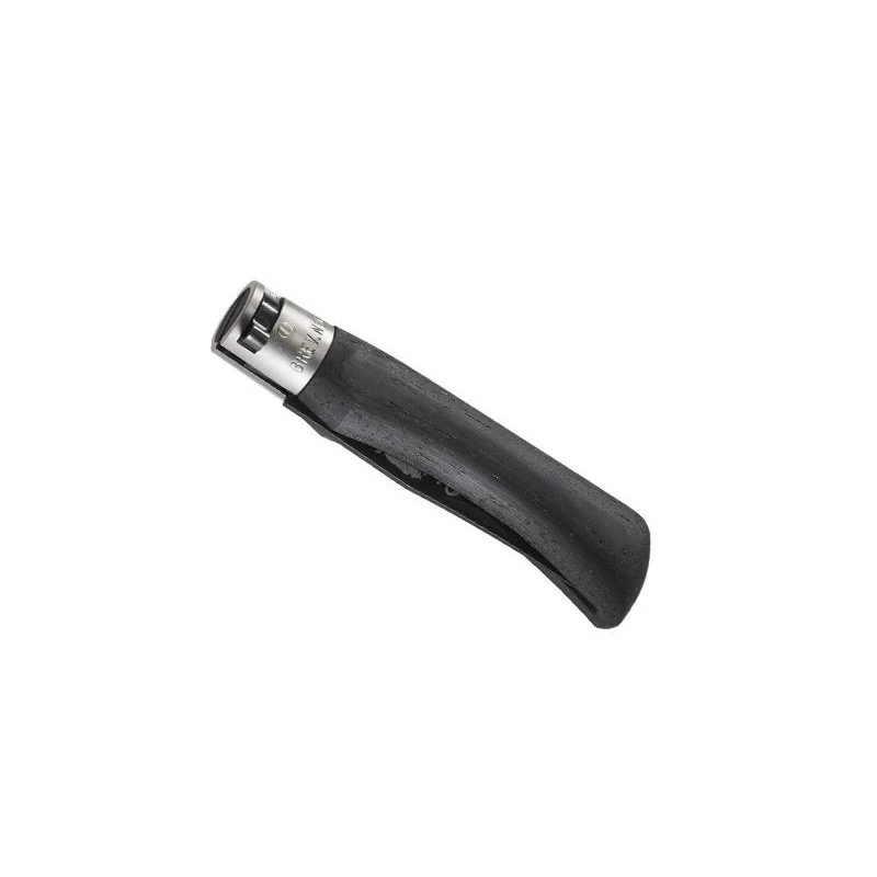 Ce couteau Old Bear 312.L porte le nom de Total Black, pourtant, ce n’est pas tout à fait vrai. En effet, sur ce modèle, la virole de sécurité située entre la lame et le manche est grise (laiton nickelé). Un petit détail en apparence mais qui en terme d’esthétique, fait toute la différence car cela vient justement casser le côté « entièrement noir ». Sinon, côté lame, pas de changement, elle est toujours à bout pointu, fabriquée en acier inox 420 avec revêtement noir (PTFE) et décorée par l’ours, symbole de la coutellerie artisanale Old Bear (Maniago en Italie). À noter que vous pouvez personnaliser la face arrière de la lame (voir bouton ajouter une gravure). Du fait qu’il s’agit d’une taille L, le manche de ce couteau Old Bear Total Black virole grise mesure 12cm de longueur, il est conçu en bois d’ayous stratifié noir. Un manche qui se veut élégant, ergonomique et facile à transporter. Couteau pliant livré en boîte individuelle avec certificat de contrôle qualité.