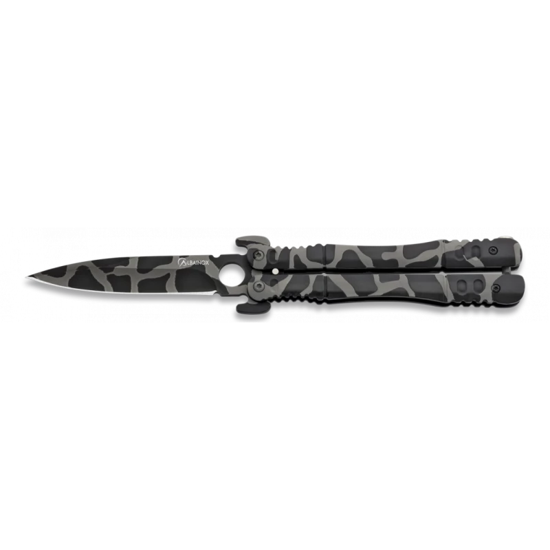 Voilà un couteau papillon Albainox qui va séduire de nombreux utilisateurs de balisongs. Il faut dire qu’il est décoré par une magnifique impression photographique façon camouflage gris avec effet 3D. Un design tout simplement spectaculaire qui conviendra notamment aux militaires. Très élégant, ce couteau papillon Albainox référence 02134 est également très ergonomique et surtout très transportable (manche de 12cm en aluminium). Un modèle particulièrement résistant, et ce, même au niveau de la lame en acier inoxydable de longueur 10cm. Une lame à bout pointu, qui elle aussi, est décorée façon camouflage gris/noir. Originale, elle est aussi ajourée d’un cercle en début de lame, juste à côté du logo Albainox inscrit en blanc, célèbre fabricant Espagnol. Un balisong au design camo à couper le souffle, et tout ça à un tarif tout à fait raisonnable !