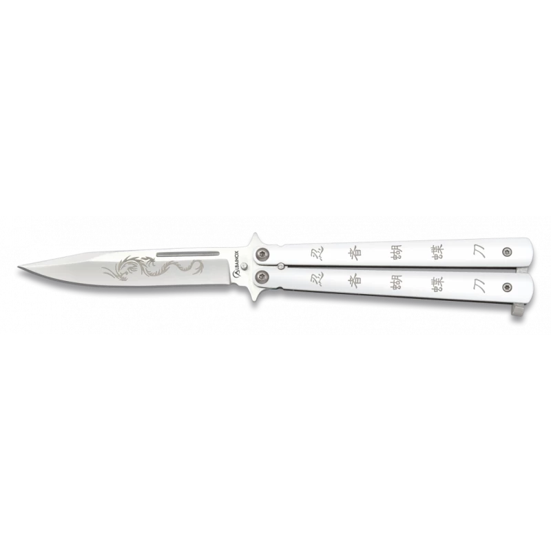 Ce couteau papillon Albainox Ninja Dragon référence 02096 est muni d’une lame de 104mm en acier inoxydable à bout pointu, elle est décorée sur la face avant par un dragon façon tribal. Très belle, la lame assure également un tranchant de qualité en toutes circonstances, elle dispose d’une longue durée de vie grâce à sa résistance à la corrosion. Il est possible de graver le verso de la lame par le texte de votre choix contre un supplément de 8,90€, de quoi obtenir un couteau papillon Albainox Ninja Dragon personnalisé selon vos goûts ! Ce modèle dispose aussi d’un manche blanc en aluminium décoré par des symboles chinois espacés, il est à la fois sobre et design et confère une prise en main exceptionnelle. Conçu en Espagne, ce couteau papillon est en plus livré avec une belle boîte colorée : parfait pour se faire plaisir ou pour offrir à quelqu’un aimant les couteaux balisong et les dragons !