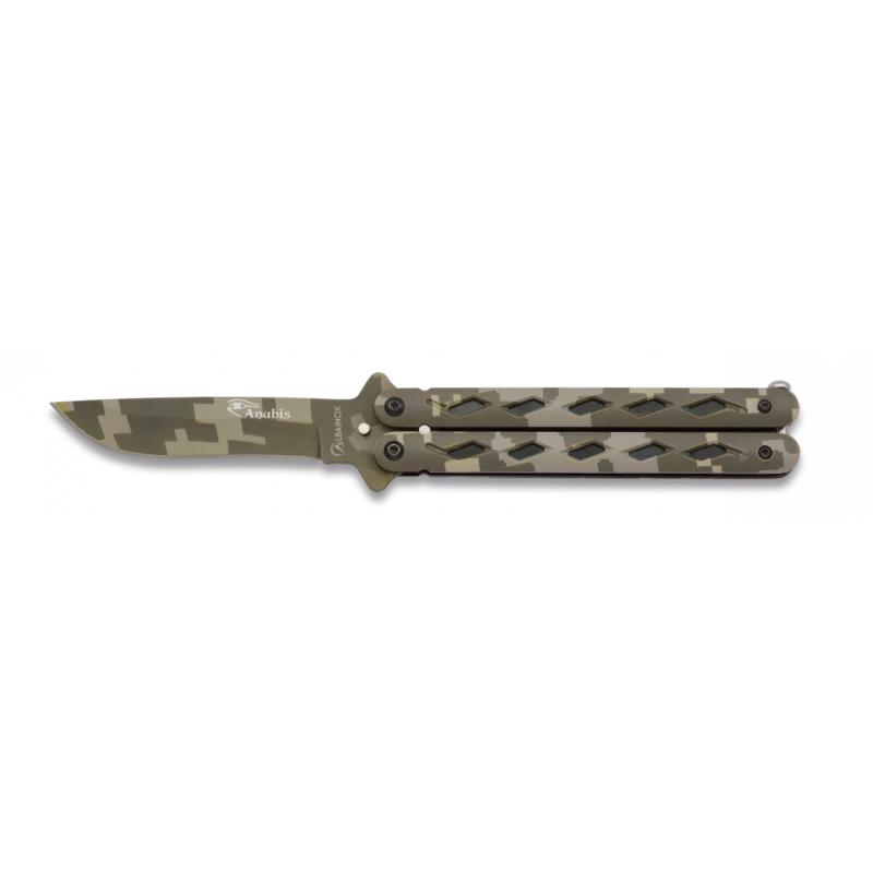 Ce couteau papillon Albainox Anubis 36221 va Ă©normĂ©ment plaire Ă tous les militaires en raison de son dĂ©cor camouflage, il pourra se confondre sans problème sur le terrain, au beau milieu de la nature. Il se compose d’un manche en aluminium ajourĂ© par 10 trous rectangulaires penchĂ©s : il est très maniable et assure des gestes d’une grande prĂ©cision. De longueur 93mm, la lame elle est fabriquĂ©e en acier inoxydable avec dĂ©coration camouflage, elle est marquĂ©e par le nom du fabricant en blanc Ă savoir Albainox, mais aussi par le nom du couteau papillon : Anubis. Un très beau couteau balisong fabriquĂ© en Espagne à offrir Ă tous les fans de couteaux militaires !
