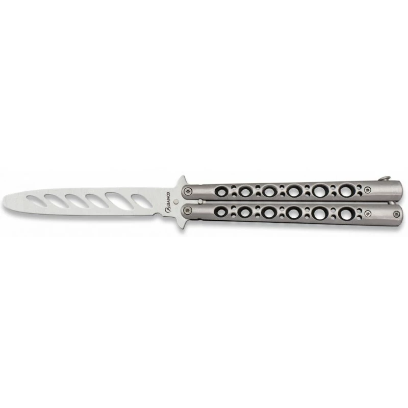 Exercez-vous à la pratique du balisong en toute sécurité, et à moindre coût, grâce à ce couteau papillon d’entraînement de la marque espagnole Martinez Albainox ! Portant la référence 02188, il est entièrement fabriqué en acier inoxydable ce qui lui vaut une bonne résistance, notamment à la corrosion/rouille.