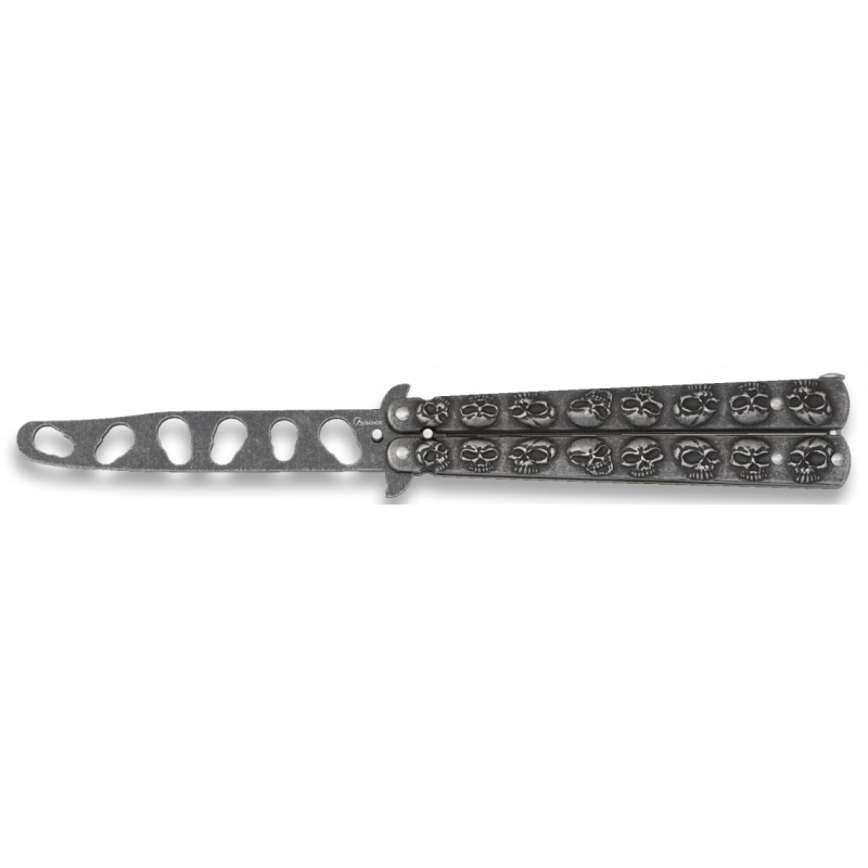 Le couteau papillon d’entrainement avec manche en acier, doté d’une finition pierre et d’un motif tête de mort, est l’outil idéal pour les amateurs de balisong à la recherche d’un design unique et original. Sa finition pierre et son motif tête de mort ajoutent une touche de style inimitable à cet outil de formation.