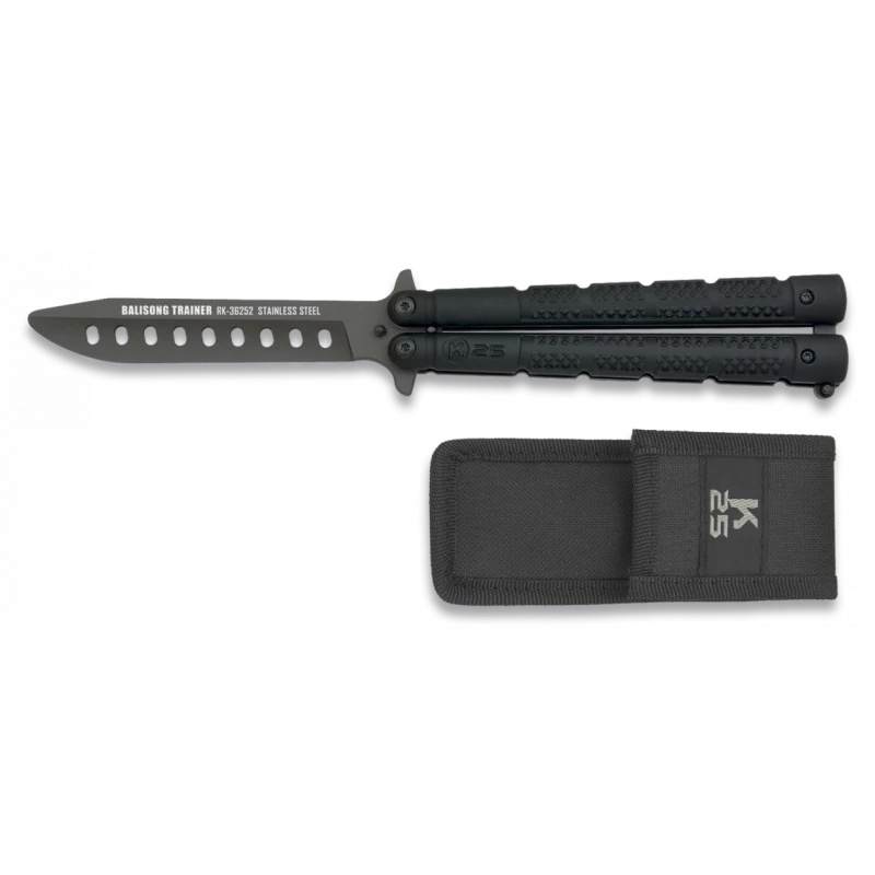 Ce couteau papillon d’entraînement K25 36252 est muni d’une lame en acier inoxydable revêtement noir : de longueur 102mm, elle est ajourée par 9 trous parfaitement alignés. Marquée du texte « Balisong Trainer » en blanc, la lame est munie d’un bout arrondi afin d’éviter les blessures lors des manipulations. Le manche lui est fabriqué en aluminium noir : un matériau aussi design que solide. De longueur 127mm, le manche est décoré par le logo de la marque Espagnole K25, il se transportera avec beaucoup de facilité au quotidien. Afin de prendre soin de votre couteau papillon d’entraînement K25, un étui de protection adapté en nylon noir est également inclus. Très élégant, l’étui est marqué par le nom du fabricant à savoir K25, il assure que votre balisong restera toujours dans un état irréprochable.