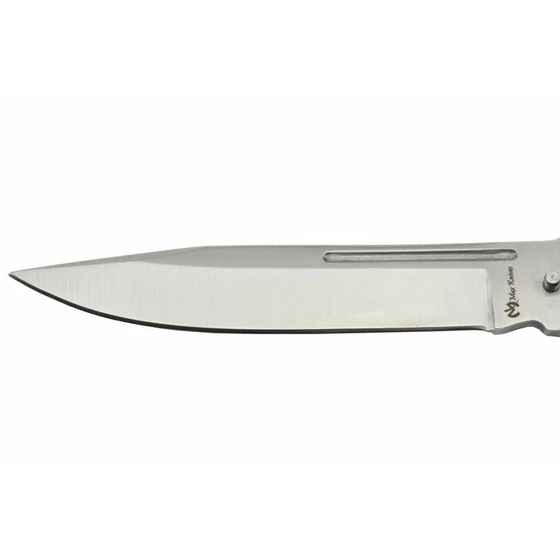 Ce couteau papillon Max Knives P24S finition silver ou argent est doté d’une grande lame en acier inoxydable 440C : elle mesure 100mm de long et se personnalise par le texte de votre choix. D’ailleurs, en la regardant de plus près, on remarque que la lame est déjà marquée du nom du fabricant à savoir Max Knives. Le manche lui est également fabriqué en acier, il résiste très bien à la corrosion et dispose d’une bonne robustesse de façon générale. Le manche a l’avantage d’être compact en ne mesurant que 130mm de long, de quoi garantir des transports toujours très faciles. Le couteau papillon Max Knives P24S se logera aisément dans toutes les poches, même les plus petites (pantalon par exemple).