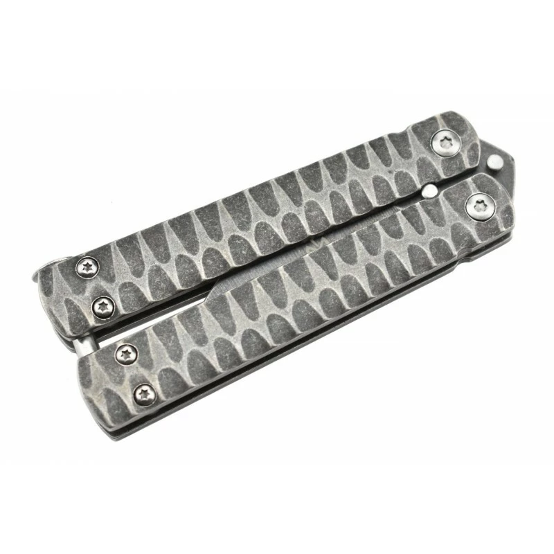 Le Max Knives P42 est un couteau papillon qui devrait beaucoup plaire à celles et ceux qui ont une petite préférence pour les manches en acier. Vous l’aurez compris, sur ce balisong, le manche est fabriqué en acier, avec une belle finition stonewash pour un aspect usé, vieilli. À titre d’information, sachez que la poignée mesure 105mm de long ce qui offrira à l’utilisateur énormément de confort lors de la prise en main.