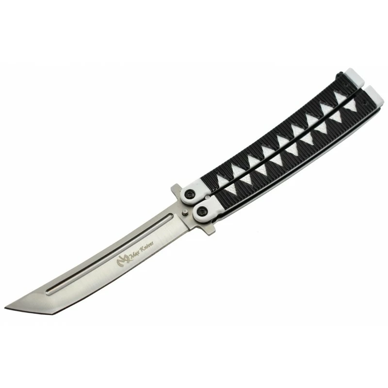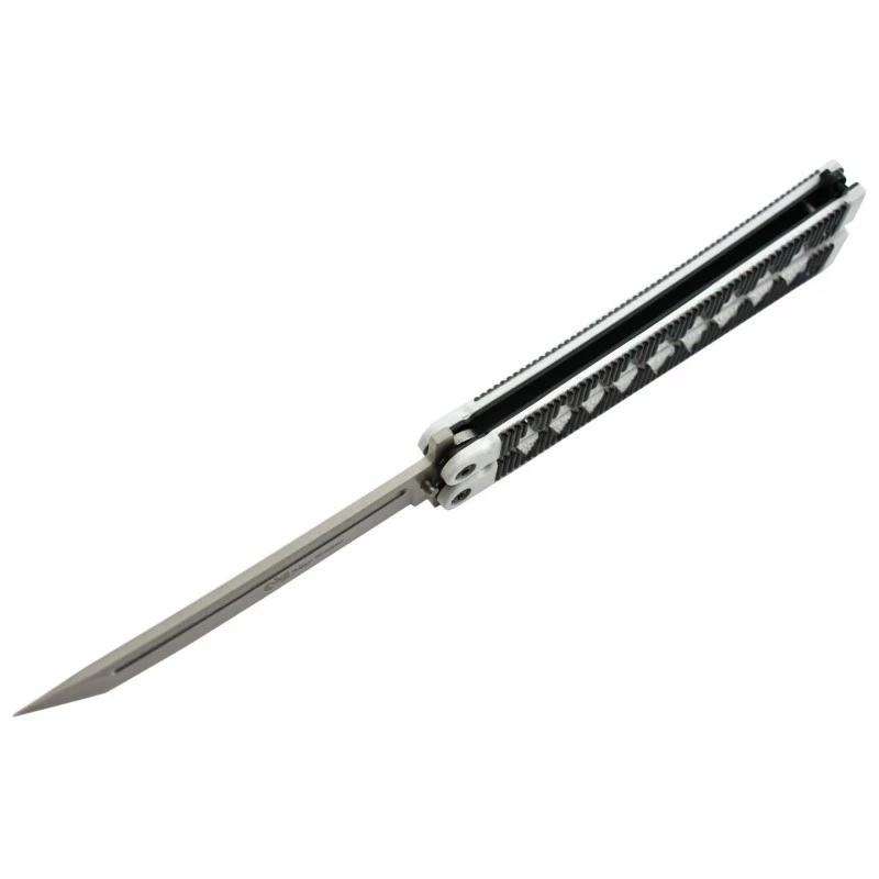 Celles et ceux qui aiment les couteaux papillons d’inspiration japonaise auront beaucoup de mal à résister à l’appel du Max Knives P46S. Un balisong qui séduit par sa forme courbée au niveau du manche de 127mm de long en aluminium blanc ainsi que noir. Le tressage japonais ne vous laissera probablement pas indifférent(e). Agréable à prendre en main, la poignée est très visuelle et riche en contraste : on peut d’ailleurs observer de nombreux triangles blancs par dessus le fond noir.