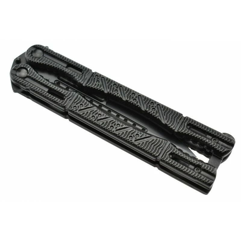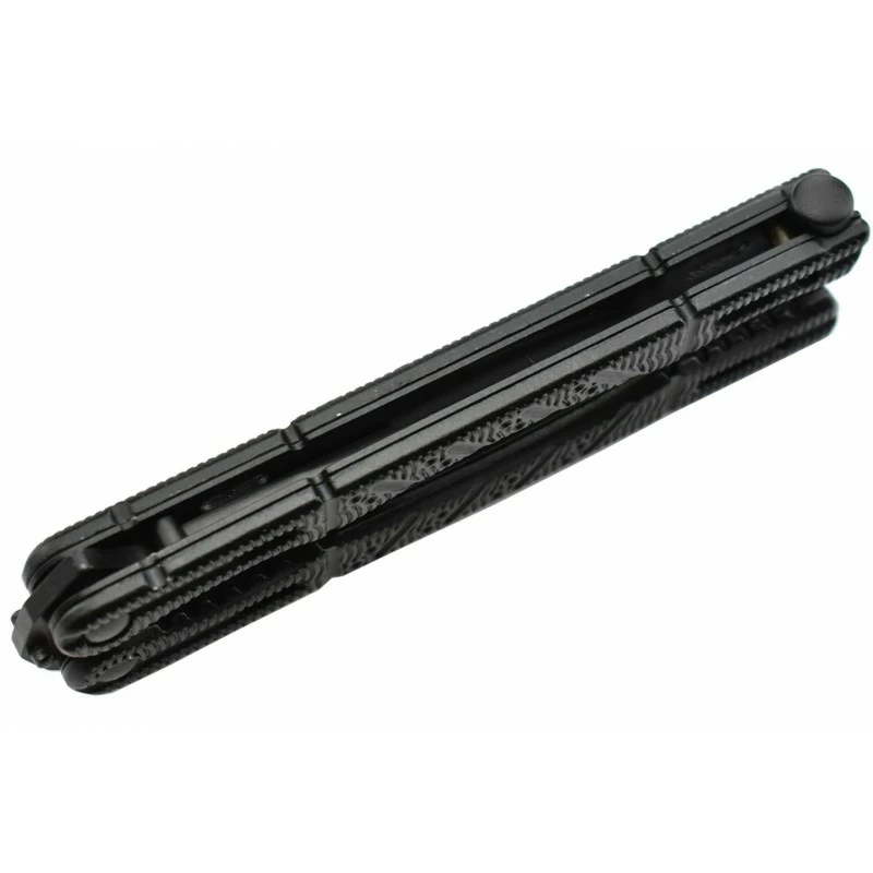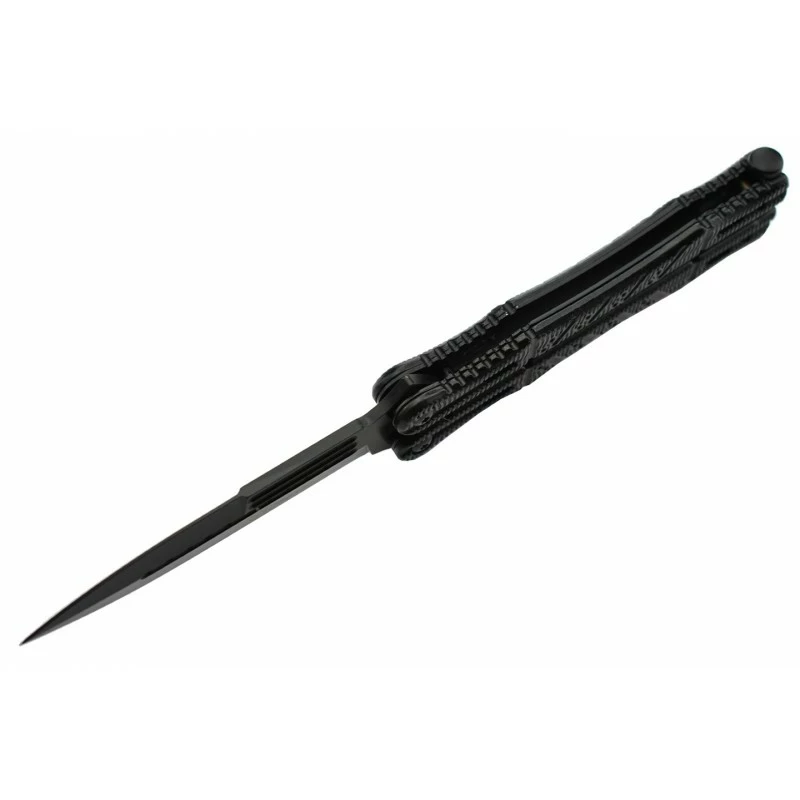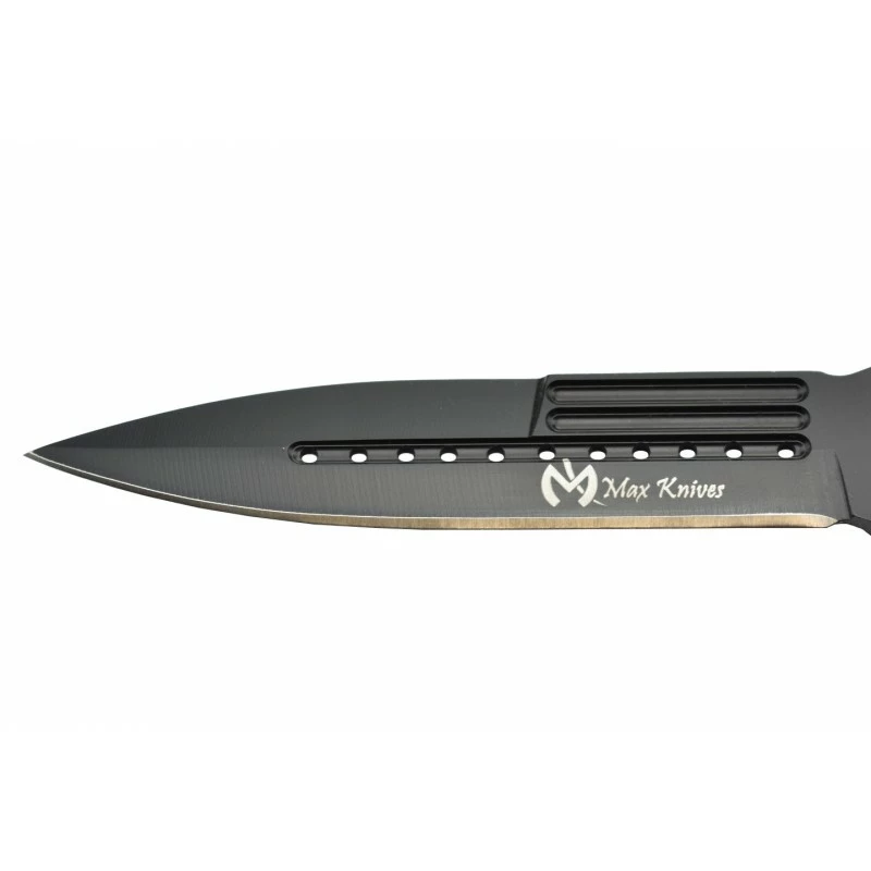 Le couteau papillon P48 de chez Max Knives a une allure tactique en raison de son aspect noir mais aussi par la forme spear point de la lame. Pourvue d’un tranchant simple, la lame de 102mm est fabriquée en acier inoxydable 3Cr13, elle est stylisée par la présence de rainures ainsi qu’une bande centrale avec ajours. Sous cette dernière, on retrouve comme souvent le logo de la marque accompagné de l’inscription Max Knives, un ensemble qui ne manquera pas de plaire aux fans.