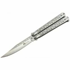 Le Max Knives P50S est la version grise « silver » du modèle P50. C’est un couteau papillon qui allie l’élégance au rapport qualité/prix. Son manche de 117mm est fait d’acier inoxydable, les deux parties mobiles sont décorées de la même manière, à savoir des motifs linéaires croisés accompagnés de formes ovales. Une belle poignée que l’on ne se lasse pas de regarder, ni d’utiliser d’ailleurs !