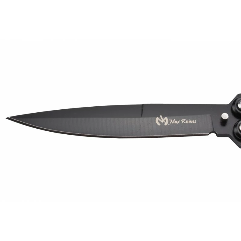 Le couteau papillon Max Knives P53B vous tapera Ă©galement dans l’Ĺ“il en raison de sa lame de forme spear point, elle aussi colorĂ©e de noir. Mesurant exactement 98mm de long, elle est fabriquĂ©e en acier inoxydable 3Cr13 et ne craint pas la rouille/corrosion. Elle est dĂ©corĂ©e de façon simple mais efficace par le logo Max Knives, d’une couleur qui ressort parfaitement par-dessus le coloris noir de la lame.