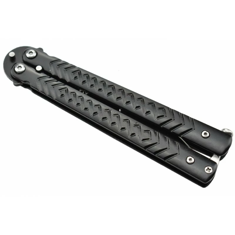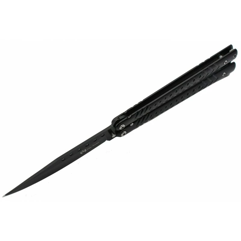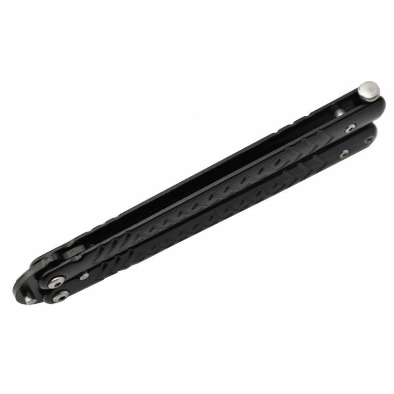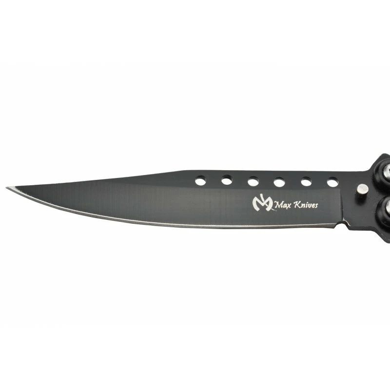Celles et ceux qui dĂ©sirent acheter un couteau papillon au style sobre mais raffinĂ© ont tout intĂ©rĂŞt Ă se retourner vers le modèle P54B de chez Max Knives. Ce balisong Ă l’apparence très sombre est dotĂ© d’un manche noir en acier inoxydable dont la longueur est de 117mm afin d’offrir une facilitĂ© de transport. Attrayant visuellement parlant, le manche noir est marquĂ© de motifs rectilignes prĂ©sents de façon identique sur les deux parties de la poignĂ©e. Dans la lignĂ©e du manche, la lame de 98mm est ajourĂ©e par des formes rondes sur la partie supĂ©rieure, une façon originale de soigner l’esthĂ©tique. FabriquĂ©e en acier inoxydable 3Cr13, elle est revĂŞtue de noir afin d’ĂŞtre en harmonie avec la poignĂ©e. Avec marquage du logo Max Knives d’une couleur claire afin d’attirer le regard : après tout vous pouvez ĂŞtre fier d’utiliser des produits de la marque Max Knives !