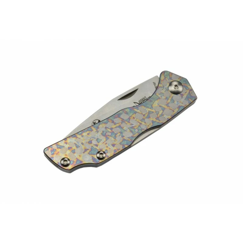 Le manche du couteau Kizer Ki3307A2 est fait de titane anodisé, sublimé par des nuances colorées conférant un look dynamique. En position fermée, il mesure environ 85mm de longueur, ce qui assure une grande facilité de transport.