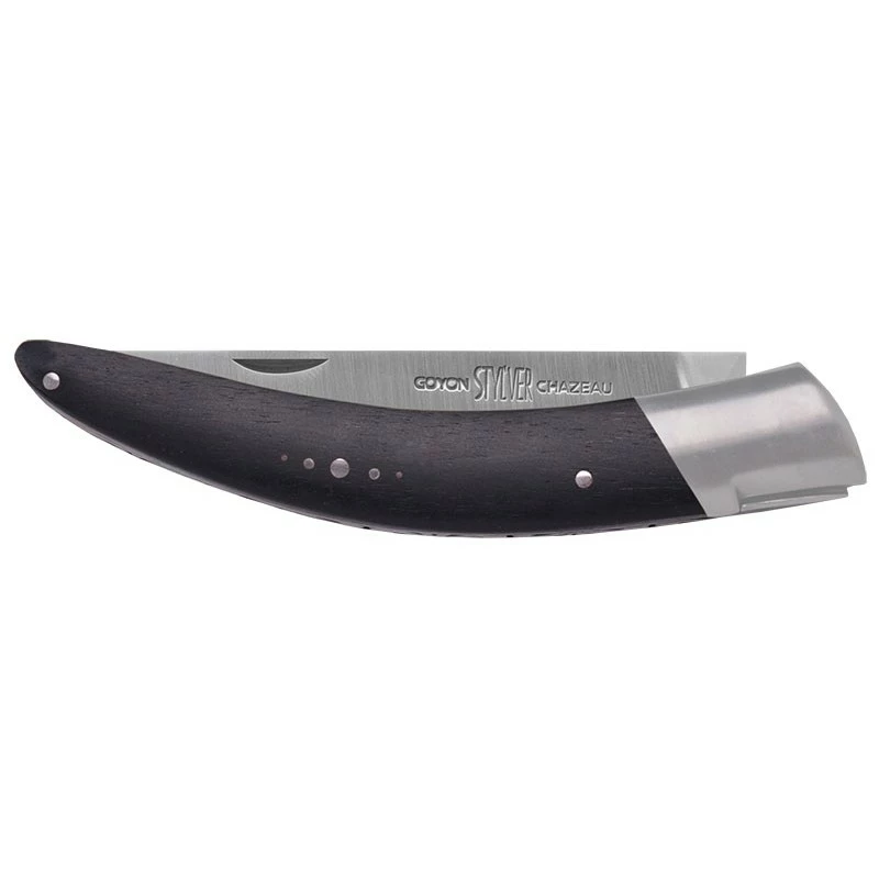Performances de coupe incomparables et Préhension inégalable complètent les caractéristiques majeures du Stylver de Goyon Chazeau, avec en haut du podium : un sublime design, élégant et moderne, inspiré des outils de coupe méditerranéens. Ce couteau de création possède un manche incurvé sur lequel est fixé par rivets deux plaquettes noires intenses en bois précieux d’ébène, un matériau naturel robuste, doux et quasiment imputrescible. D’un point de vue symbolique, ce matériau incarne la puissance, la protection, la chance et la pureté. La mitre métallique et le ressort guilloché de façon artisanale achèvent l’élégant manche du Stylver. Ce couteau fermant dispose d’une lame Clip point à double émouture conçue dans acier inoxydable de qualité, reconnu universellement pour sa tenue de fil de tranchant et sa facilité d’entretien : le 12C27 Sandvik. Un système d’ouverture traditionnel à cran forcé est intégré au couteau. Le Goyon Chazeau Stylver vous sera remis dans une boîte cadeau en carton, dans laquelle se trouvera un étui marron pleine fleur.