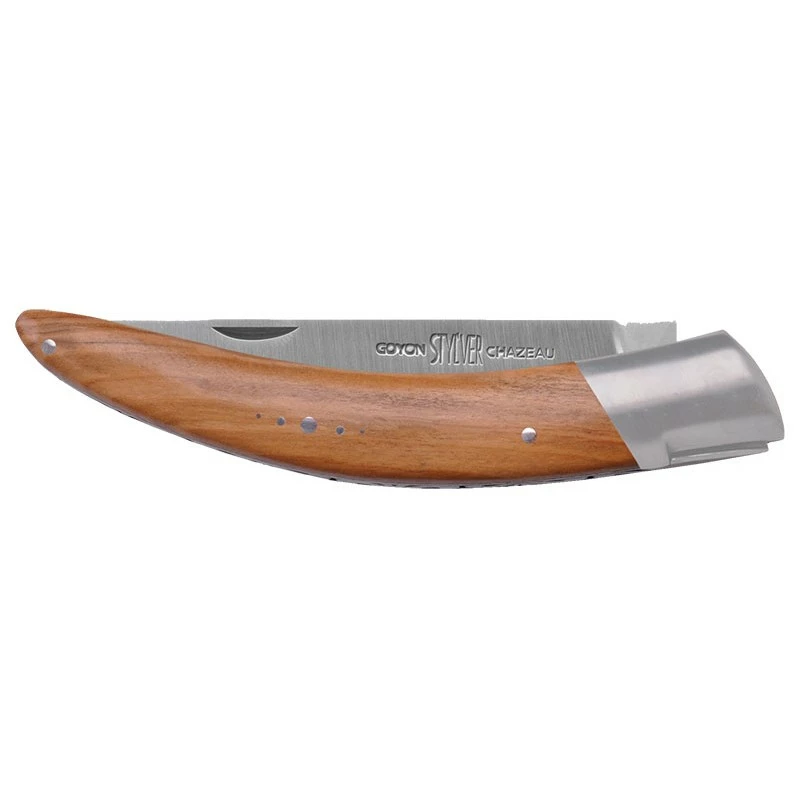 DĂ©couvrez le couteau fermant Stylver, un vĂ©ritable chef-d’Ĺ“uvre de la coutellerie française artisanale Goyon Chazeau ! InspirĂ© des couteaux mĂ©diterranĂ©ens, ce couteau a Ă©tĂ© conçu avec une ergonomie parfaite pour une prise en main incomparable. Son manche mitrĂ© est disponible en plusieurs bois, tels que le pistachier, l’Ă©bène, l’olivier et le bois de cade, et est montĂ© et guillochĂ© Ă la main pour une finition irrĂ©prochable. Il s’agit ici de la version bois olivier. La lame forgĂ©e en acier inoxydable trempĂ© Sandvik 12C27 mesure 110mm de longueur technique, dont 90mm sont visibles. Avec son entablure, sa double Ă©mouture et son cran forcĂ©, ce couteau offre une performance de coupe exceptionnelle. Le ressort forgĂ© guillochĂ© main et le montage par rivets assurent la qualitĂ© de ce couteau de crĂ©ation 100% française. Vous recevrez le couteau dans une boĂ®te carton accompagnĂ©e d’un Ă©tui en cuir marron pleine fleur. Optez pour le couteau fermant Stylver pour un outil de qualitĂ© supĂ©rieure et un compagnon Ă©lĂ©gant pour votre quotidien !