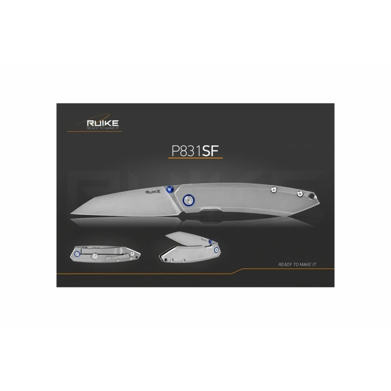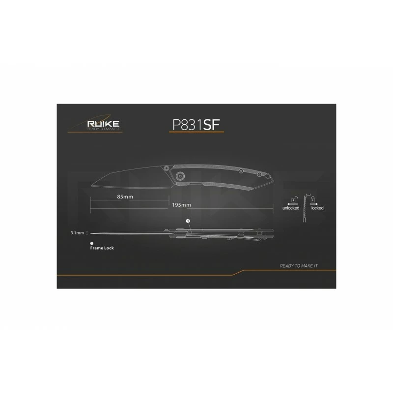 Le couteau pliant P831SF, par Ruike, possède une lame délavée de 85mm de longueur, conçue et fabriquée en acier inoxydable 14C28N Sandvik, avec traitement cryogénique. La lame se verrouille par le biais d’un Frame Lock, avec Beta Plus ce qui permet de passer d’un couteau pliant à un couteau fixe pour des conditions de coupe toujours plus exigeantes. Une lame qui s’ouvre plus facilement grâce au thumb stud bleu vif qui ne manquera pas d’apporter une petite touche décorative supplémentaire. Avec marquage du logo Ruike, possibilité de gravure (voir bouton ci-dessous).