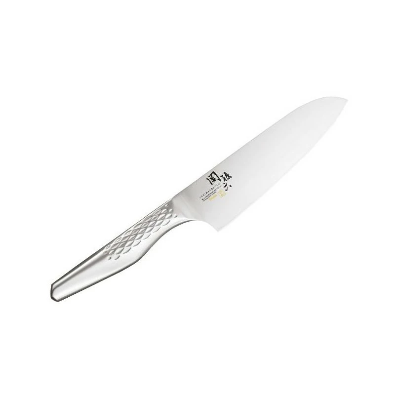 Ce couteau Santoku appartient à la marque Japonaise Kai, plus précisément à la série Seki Magoroku Shoso. Une série qui se distingue par ses couteaux de cuisine à structure intégrale, sans soudure entre la lame et le manche pour une robustesse à toute épreuve. Idéal pour la découpe des légumes, viandes et poissons, ce couteau Santoku Kai Shoso AB.5156 se dote d’une lame de 165mm de longueur, fabriquée en acier inoxydable 1K6 dont la teneur en carbone est de 0,8% et la dureté Rockwell d’environ 58. Au tranchant convexe et à la finition satinée, la lame est aiguisée à vitesse lente afin que la qualité de coupe soit au rendez-vous, et à son apogée. Elle est pour information décorée par des inscriptions, ainsi que sigles/symboles Japonais.