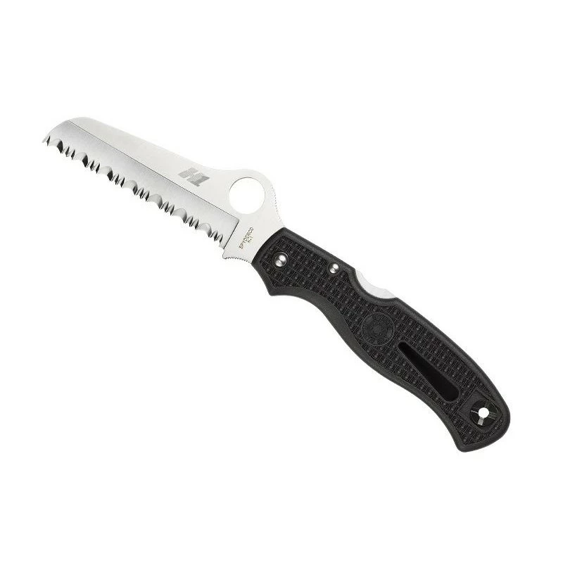Le Spyderco Atlantic Salt rĂ©fĂ©rence C89SBK est un couteau de poche de sauvetage (Rescue). Il faut dire qu’il intègre une lame Ă dents Ă cran conçue en acier inoxydable H1, un acier extrĂŞmement rĂ©sistant Ă la rouille (longueur de la lame 94mm). Comme toujours chez Spyderco, on retrouve un trou dans la lame offrant une ouverture facilitĂ©e, qui plus est d’une seule main. Le manche est lui fabriquĂ© en FRN noir (nylon + fibre de verre), il intègre un clip de poche ainsi qu’un dĂ©manilleur. De ce fait, le couteau Spyderco Atlantic Salt C89SBK sera parfait pour la vie Ă bord du bateau : un modèle qui conviendra donc parfaitement aux marins. Parfait pour prendre le large dans d’excellentes conditions !