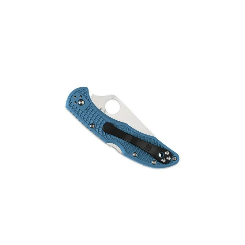 Voici le très célèbre couteau pliant Spyderco Delica 4 dont le manche en FRN (nylon/fibre de verre) est de couleur bleue. Cela confère au manche un aspect plus moderne en accord avec son temps. Robuste, le manche mesure 11cm de longueur et intègre un clip noir au verso pour faciliter les déplacements et mouvements avec le couteau. Portant la référence C11FPBL, ce couteau Spyderco Delica 4 bleu dispose aussi d’une lame à fond plat de longueur 73mm avec en guise d’ajour le gros trou caractéristique de la marque Américaine Spyderco. En plus d’apporter son lot d’esthétisme, il est également très utile puisqu’il permet de déployer la lame en acier VG-10 (à cran) toujours plus rapidement. Si vous aimez le bleu, nul doute que ce couteau de poche Spyderco Delica 4 vous fera craquer ! Et sur ce modèle, n’oubliez pas la personnalisation disponible sur les deux faces de la lame (procédé gravure).