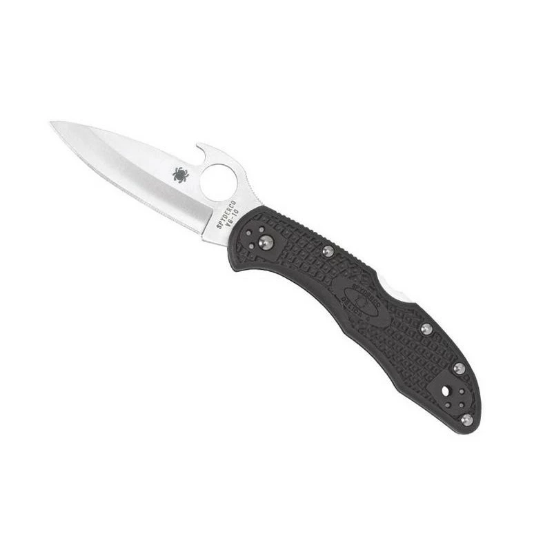 Avec le couteau Spyderco Delica 4 Emerson Opener (référence C11PGYW), vous allez pouvoir être toujours plus réactif lors des situations urgentes. Le crochet Wave breveté d’Emerson permet à l’utilisateur de pouvoir ouvrir le couteau en même temps qu’il le sort de sa poche, de quoi gagner quelques secondes qui feront tout la différence. Ce modèle est donc un concentré d’innovation : il va ravir les aventuriers les plus modernes ! Toujours décorée d’un trou, la lame à cran en acier inoxydable VG-10 est personnalisable au moyen d’une gravure (+8,90€), elle bénéficie d’une excellente résistance à la corrosion. Le manche du couteau Spyderco Delica 4 Emerson est conçu en nylon et fibre de verre noir : un matériau souvent utilisé par la coutellerie Américaine en raison de son excellent rapport ergonomie/robustesse. Mesurant 11cm de longueur en position fermée, le couteau Spyderco Delica 4 C11PGYW est relativement facile à transporter : il tient sans problème dans une poche. Les déplacements sont également facilitées par la présence d’un clip de poche.