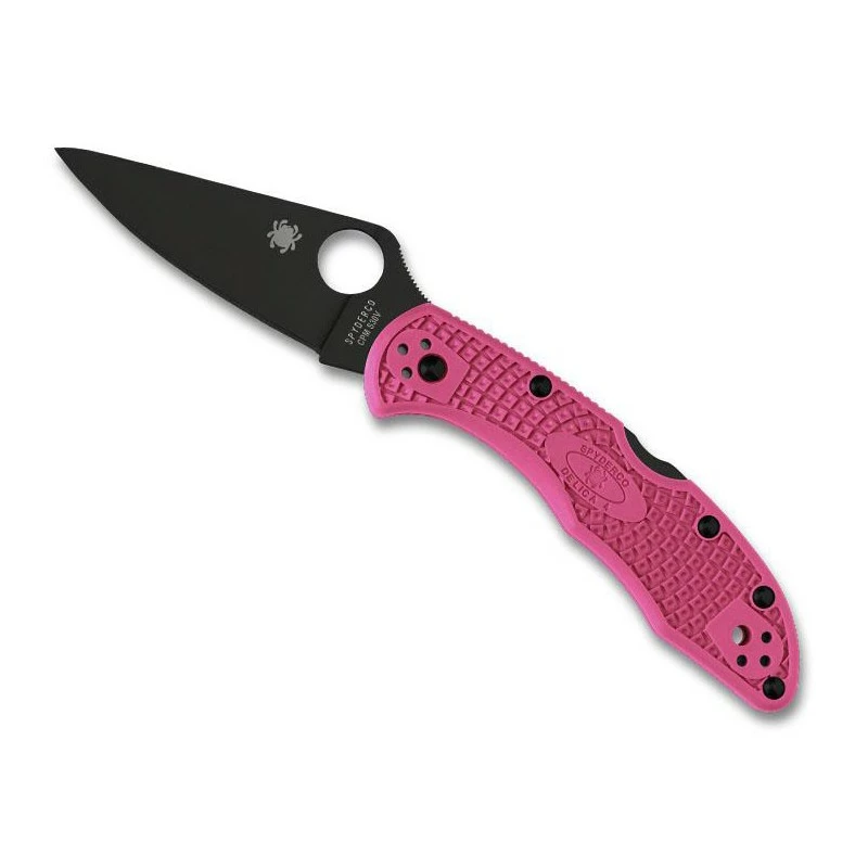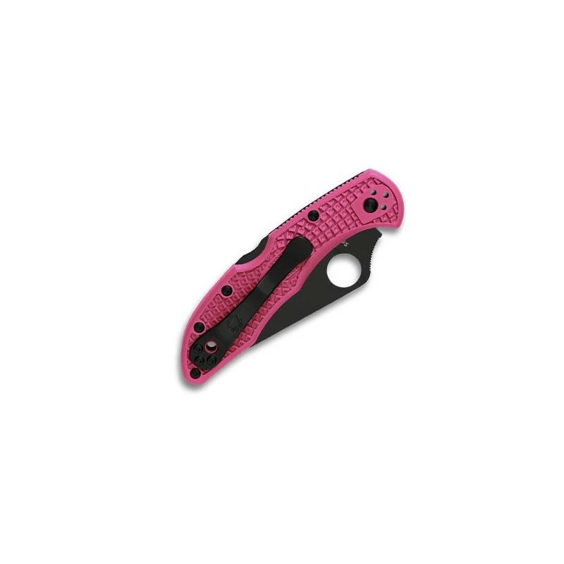 Ce couteau Spyderco C11FPPNS30VBK est des plus Ă©tonnants, ou encore audacieux si vous prĂ©fĂ©rez. Il s’agit du très populaire modèle Delica 4 prĂ©sentant une belle association de couleurs. Il fallait oser utiliser le rose pour le manche en mĂŞme temps que le noir pour la lame, mais avouez que le rĂ©sultat est des plus spectaculaires. Ce couteau Spyderco Delica 4 rose possède une lame de 108mm en acier CPM-S30V avec revĂŞtement noir nitrure de titane, elle est ajourĂ©e, Ă profil plat, et Ă mĂ©canisme de verrouillage back lock. La poignĂ©e mesure elle 11cm de long ce qui confère une facilitĂ© de transport certaine, elle est fabriquĂ©e en nylon et fibre de verre rose que l’on appelle FRN. En plus d’ĂŞtre Ă©lĂ©gant, ce matĂ©riau est ergonomique en procurant un grand confort de prise en main, tout en apportant une bonne soliditĂ©, rĂ©sistance. Un clip de poche noir Ă quatre positions est prĂ©sent au dos de la poignĂ©e pour faciliter le transport du couteau, sa couleur assure une belle harmonie avec l’ensemble.
