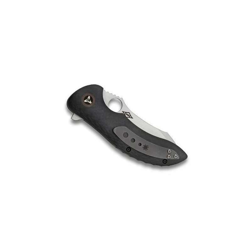 Le Spyderco Magnitude C212CFP vous surprendra également de part son manche de 12cm en fibre de carbone noir, avec entretoise et pivot en G10 marron pour la touche design. Un manche méticuleusement usiné au design à couper le souffle ! À noter que la prise en main est elle aussi excellente en toutes circonstances. Le dos de la poignée en fibre de carbone intègre un clip de poche qui facilite énormément les déplacements et mouvements avec le couteau Spyderco Magnitude.