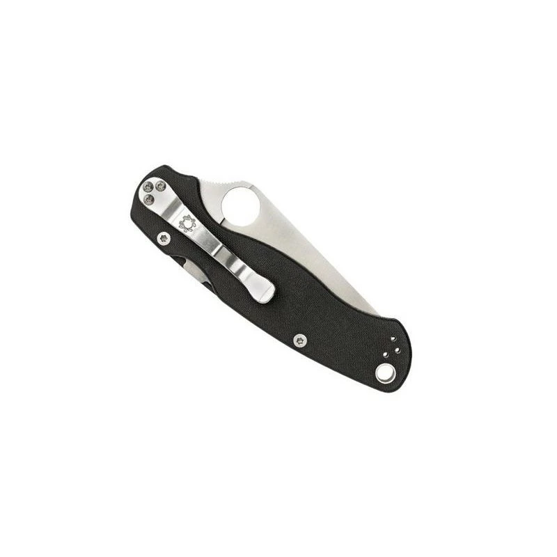 Muni de la référence C81GP2, ce couteau pliant Spyderco Para Military 2 se distingue de part son manche noir en G10 de longueur 12cm. C’est une couleur plus sobre, ou plus « passe partout » que celle que l’on trouve chez son frère le Spyderco Para Military 2 camo. Grâce au clip de poche au dos du manche noir, le Spyderco Para Military 2 noir est facile à transporter : il accompagnera facilement les militaires ou aventuriers sur le terrain. Au niveau de la lame, pas de changement, elle est aussi fabriquée en acier inoxydable CPM-S30V avec mécanisme de verrouillage « Compression Lock ». Mesurant 8,7cm de longueur, la lame est munie d’un bout pointu ainsi qu’un trou pour l’ouverture à une main. Elle est décorée par le motif Spyderco et se personnalise par un texte (+8,90€). L’autre avantage, c’est qu’elle bénéficie d’une excellente résistance face à la corrosion.